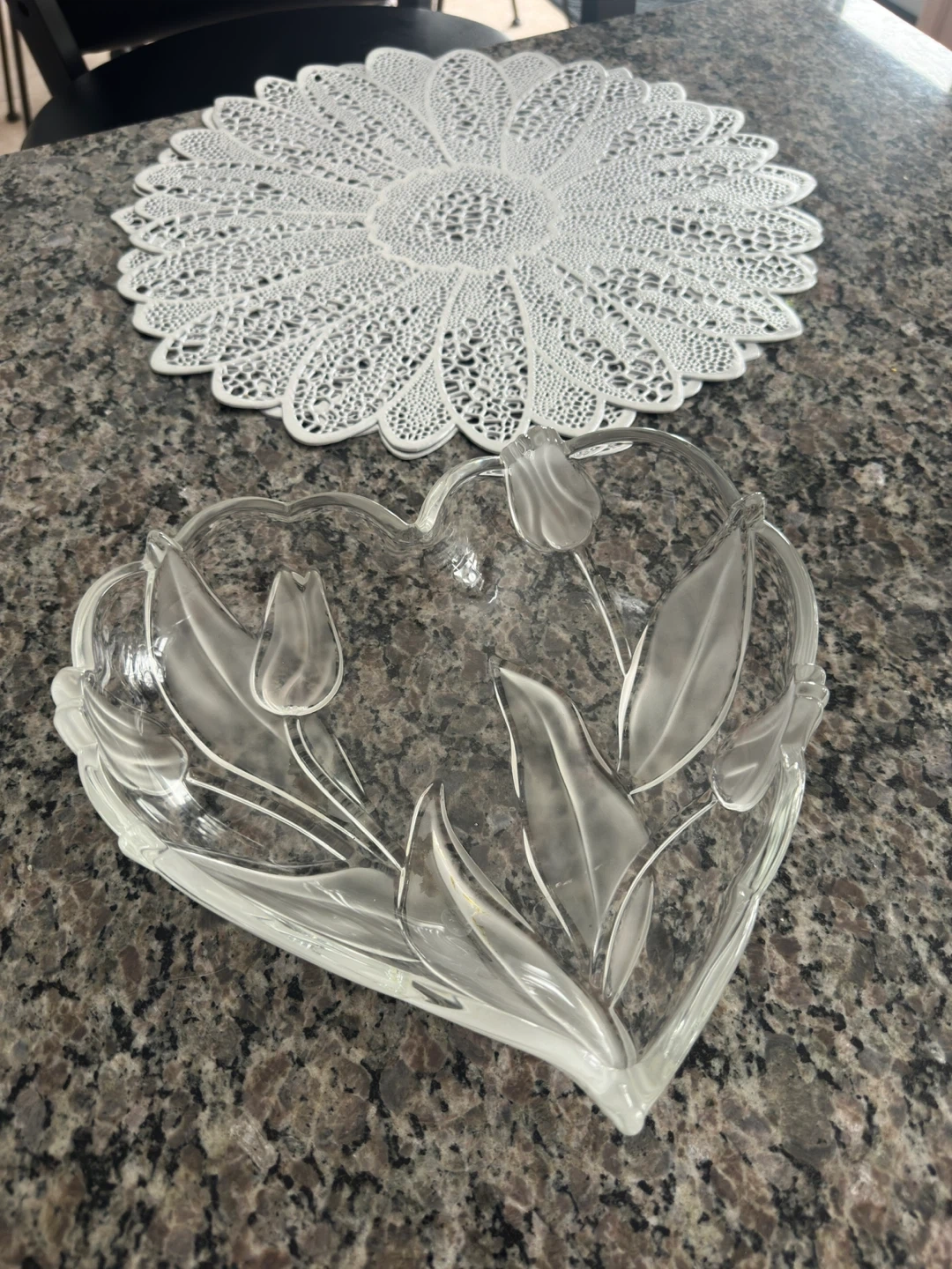 A collection of clear and green glass serving dishes and bowls. Includes a heart-shaped dish, a tiered cake stand, a decorative footed bowl, and a set of green glass bowls. Perfect for entertaining or everyday use!