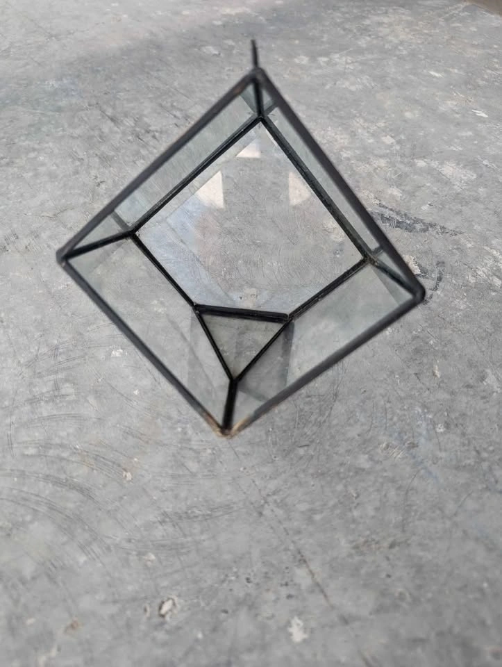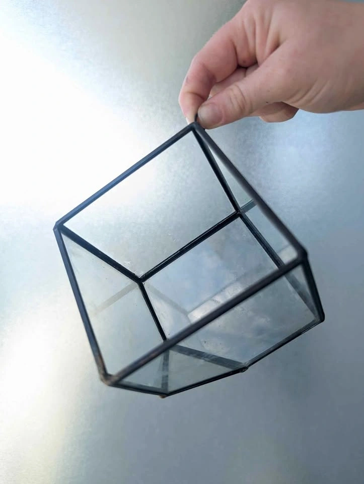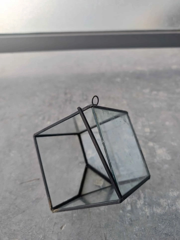 - Geometric glass plant terrarium, about 4.5" wide. Can be hung or placed on a desk. Has a small metal piece that is lifting but can be reattached with glue. $5