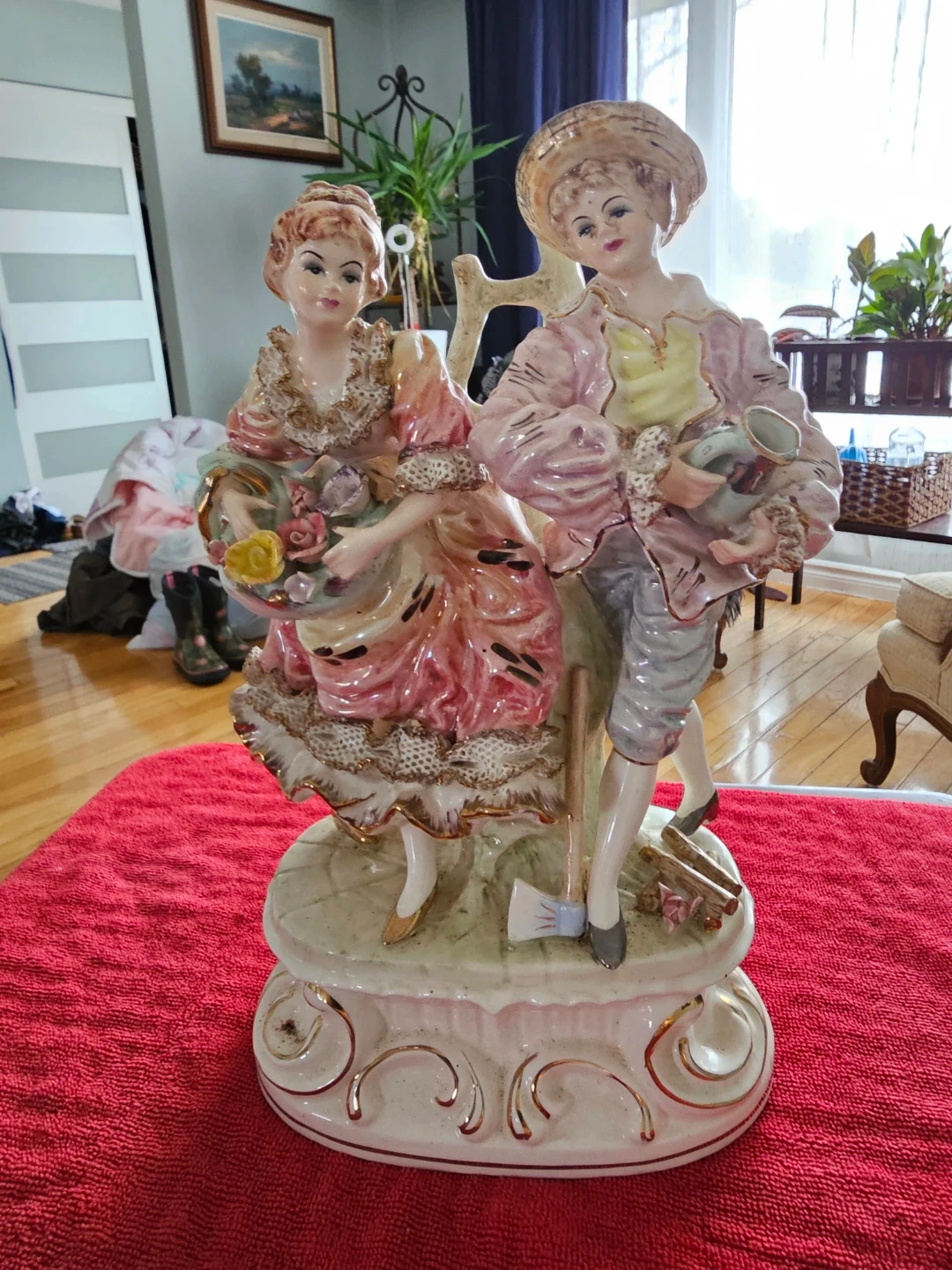 This is a lovely vintage porcelain figurine featuring a couple adorned with flowers. It's a decorative piece with intricate details on their clothing and the basket of flowers. The figurine is marked "JAPAN" on the bottom.