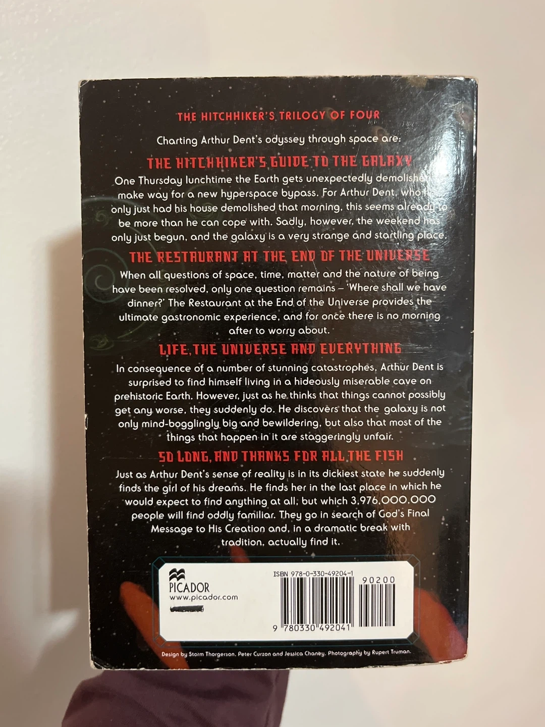 This is The Hitchhiker's Guide to the Galaxy: The Trilogy of Four by Douglas Adams. It contains "The Hitchhiker's Guide to the Galaxy", "The Restaurant at the End of the Universe", and "Life, the Universe and Everything". It also includes "So Long, and Thanks for All the Fish". It's a paperback book.