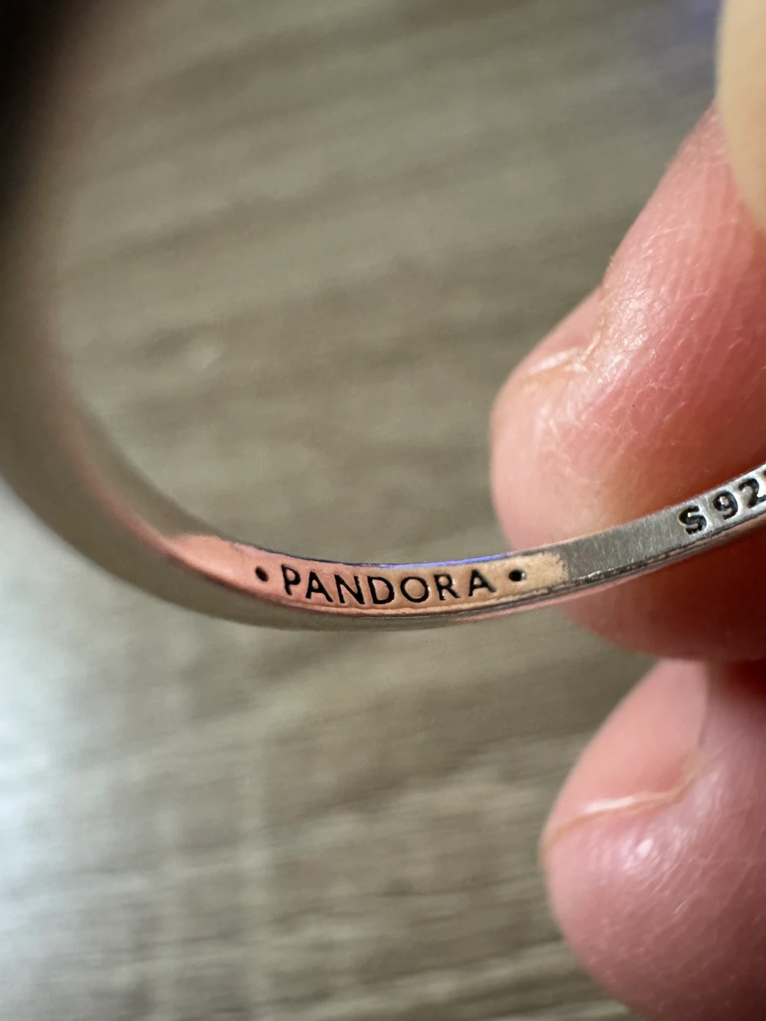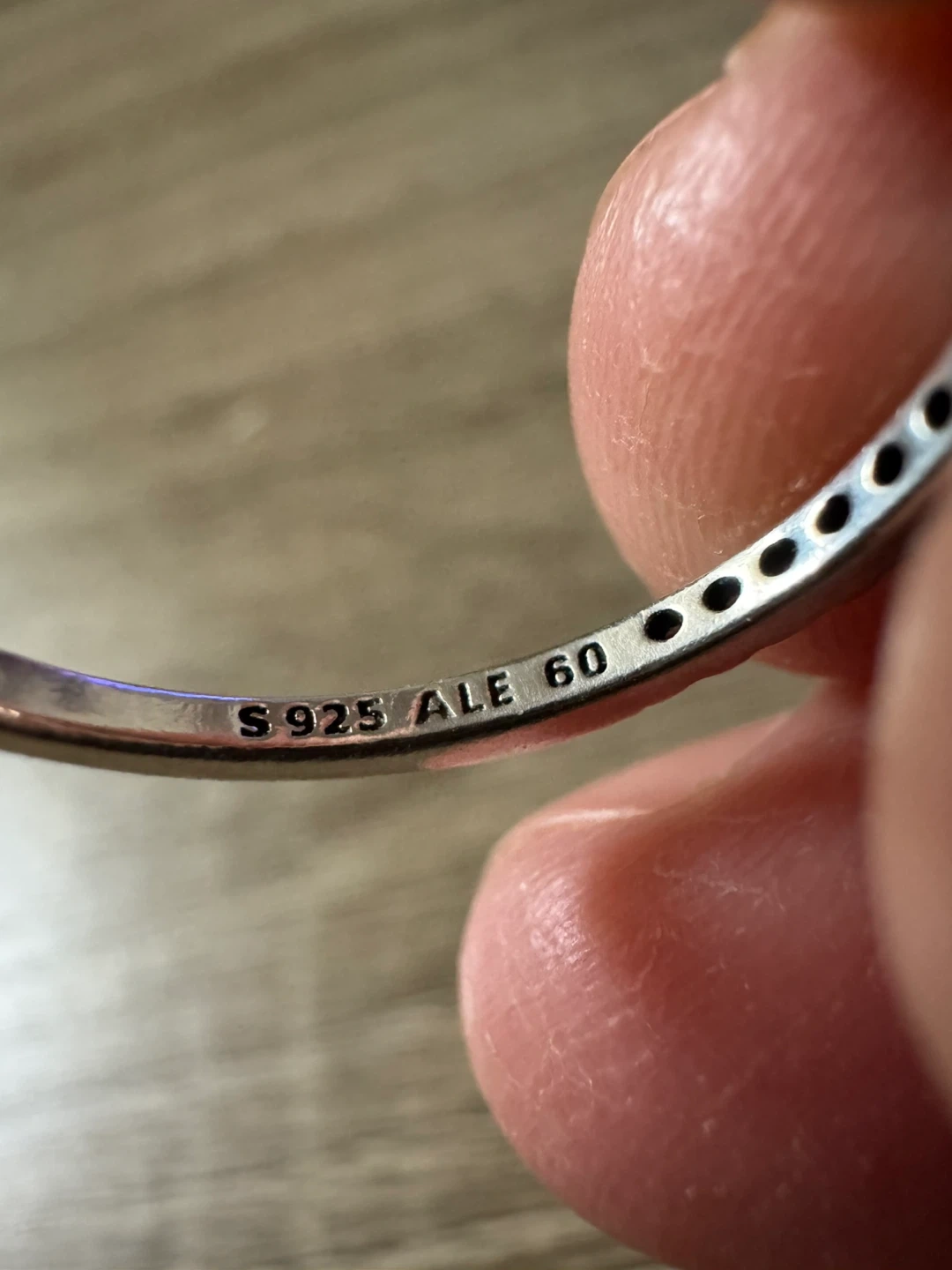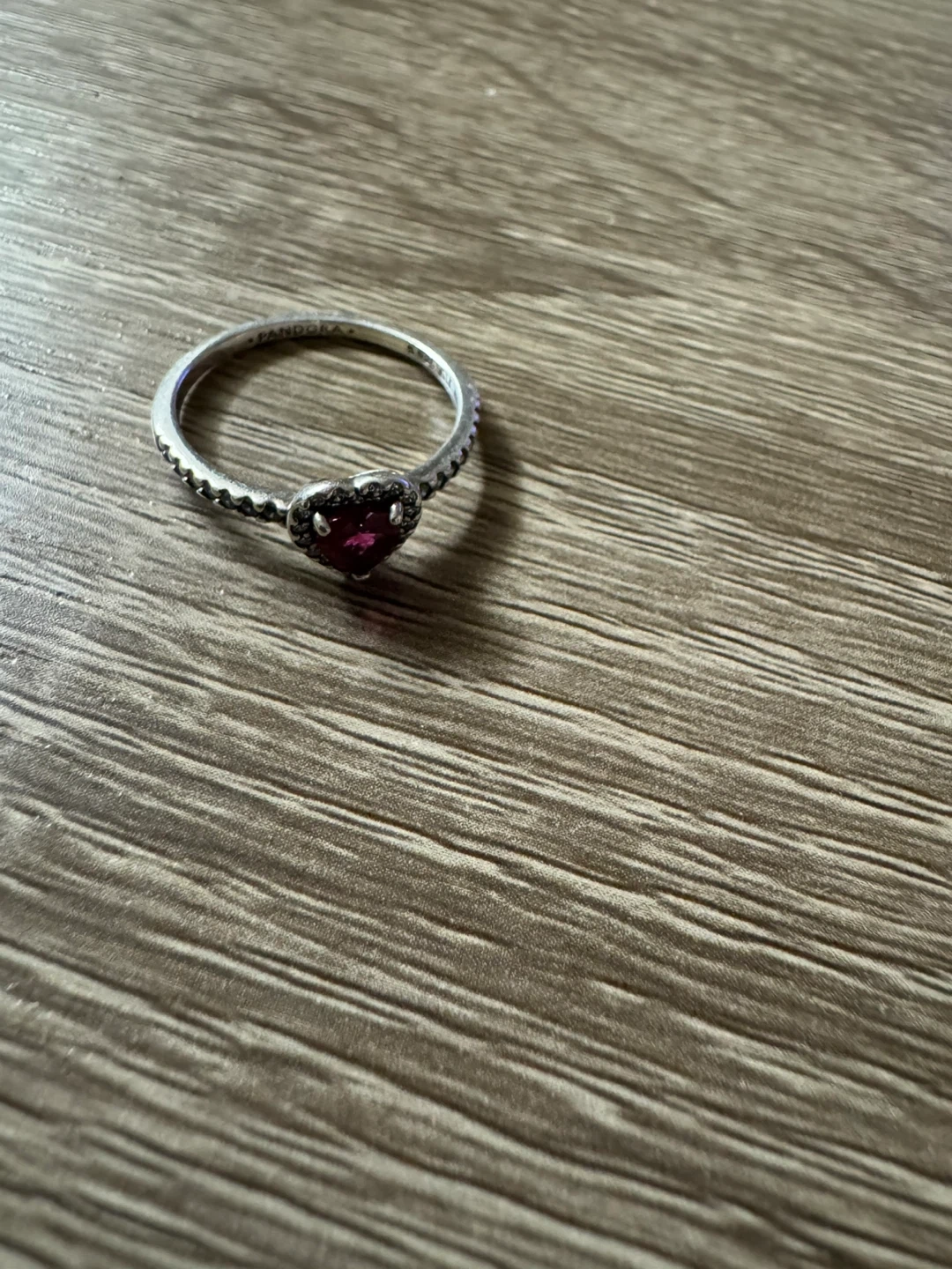 This Pandora ring is crafted from sterling silver with a heart-shaped ruby-red stone. It's accented with small clear stones around the main gem and has a braided band. Features "S925 ALE 60" inscribed on the inside.