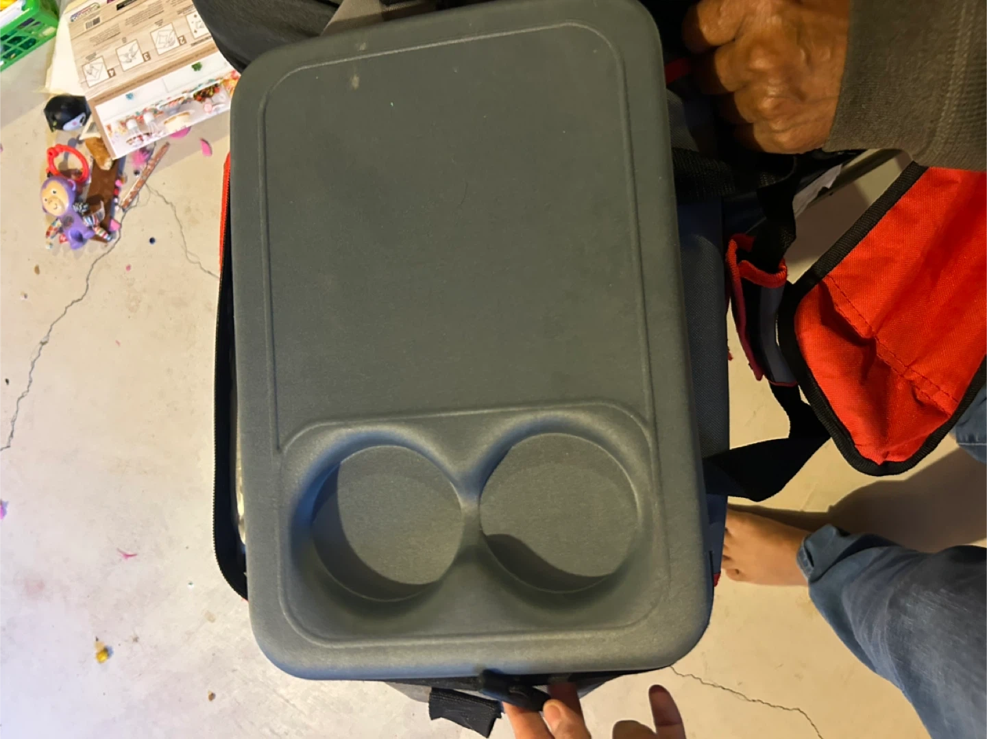 This is an Outbound cooler bag. It features two cup holders integrated into the top lid. The interior is insulated for keeping items cool.