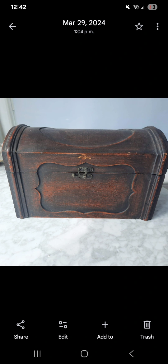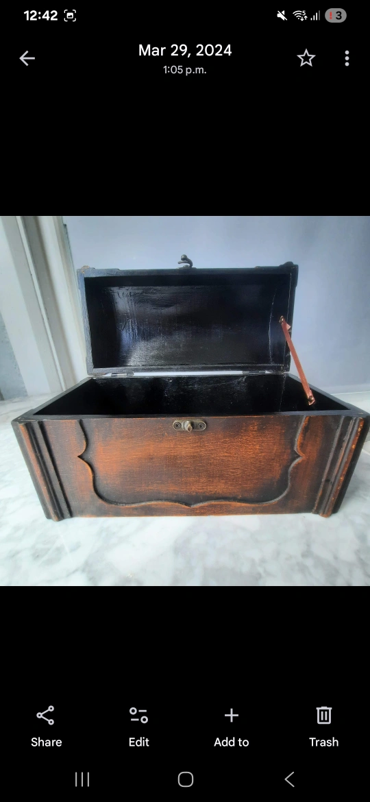 Selling a small wooden treasure chest. It has a rustic, vintage look with a dark brown and reddish finish. It's perfect for storing keepsakes or adding a decorative touch to any room.