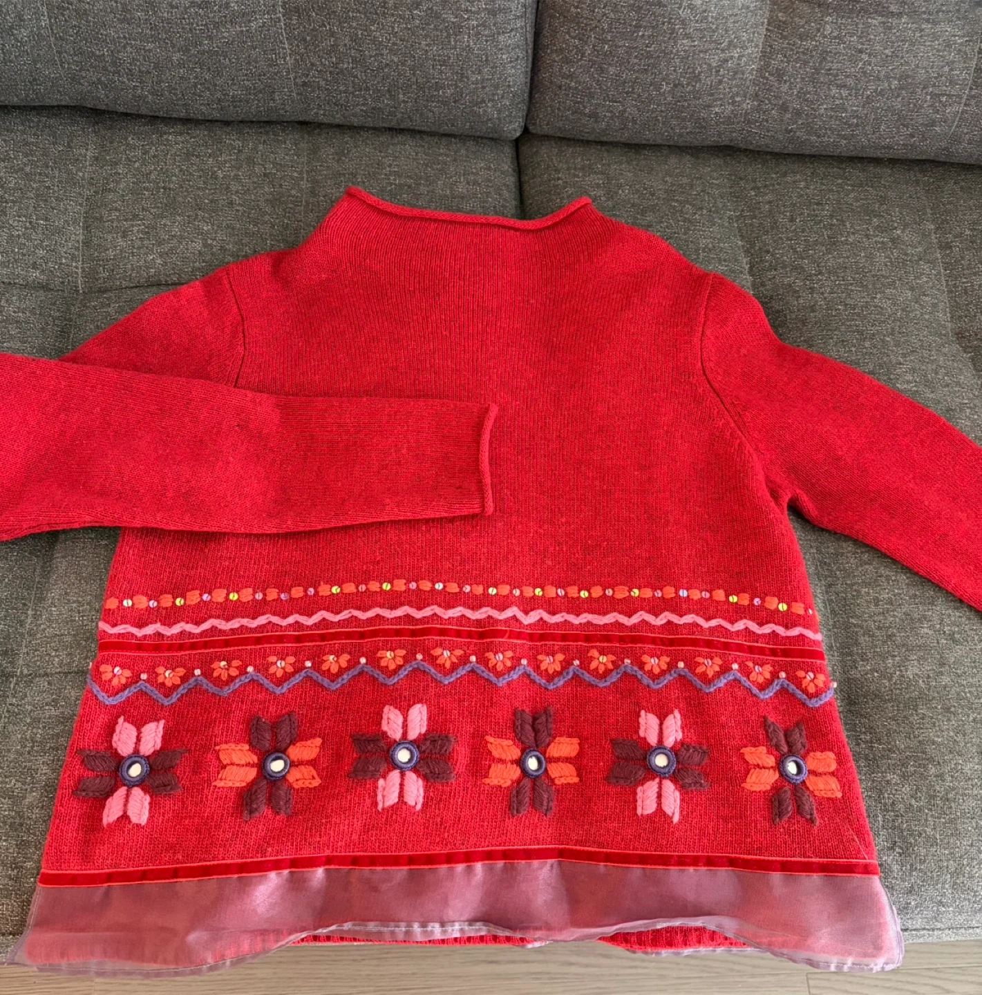 A beautiful red colour with intricate floral embroidery and a sheer hemline.