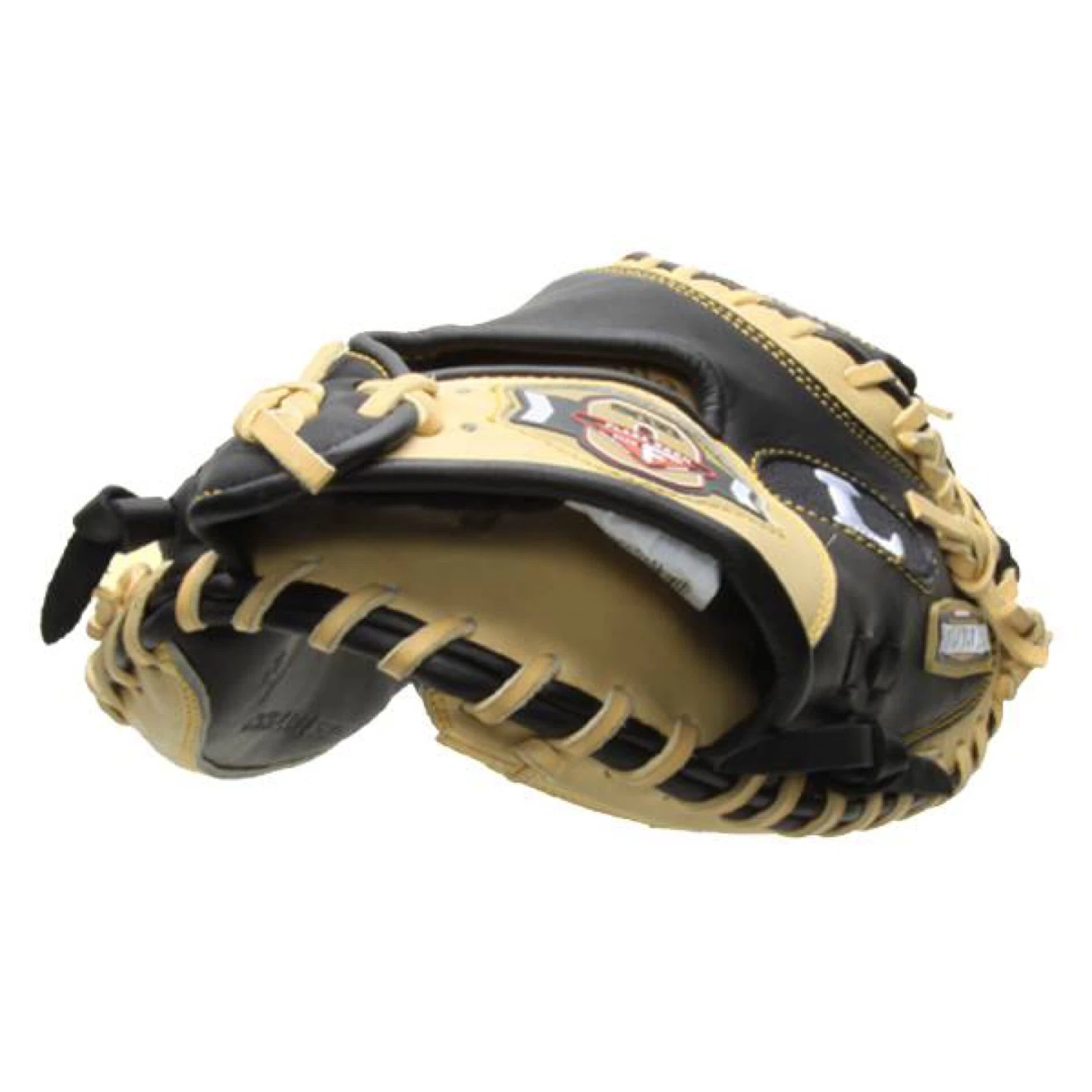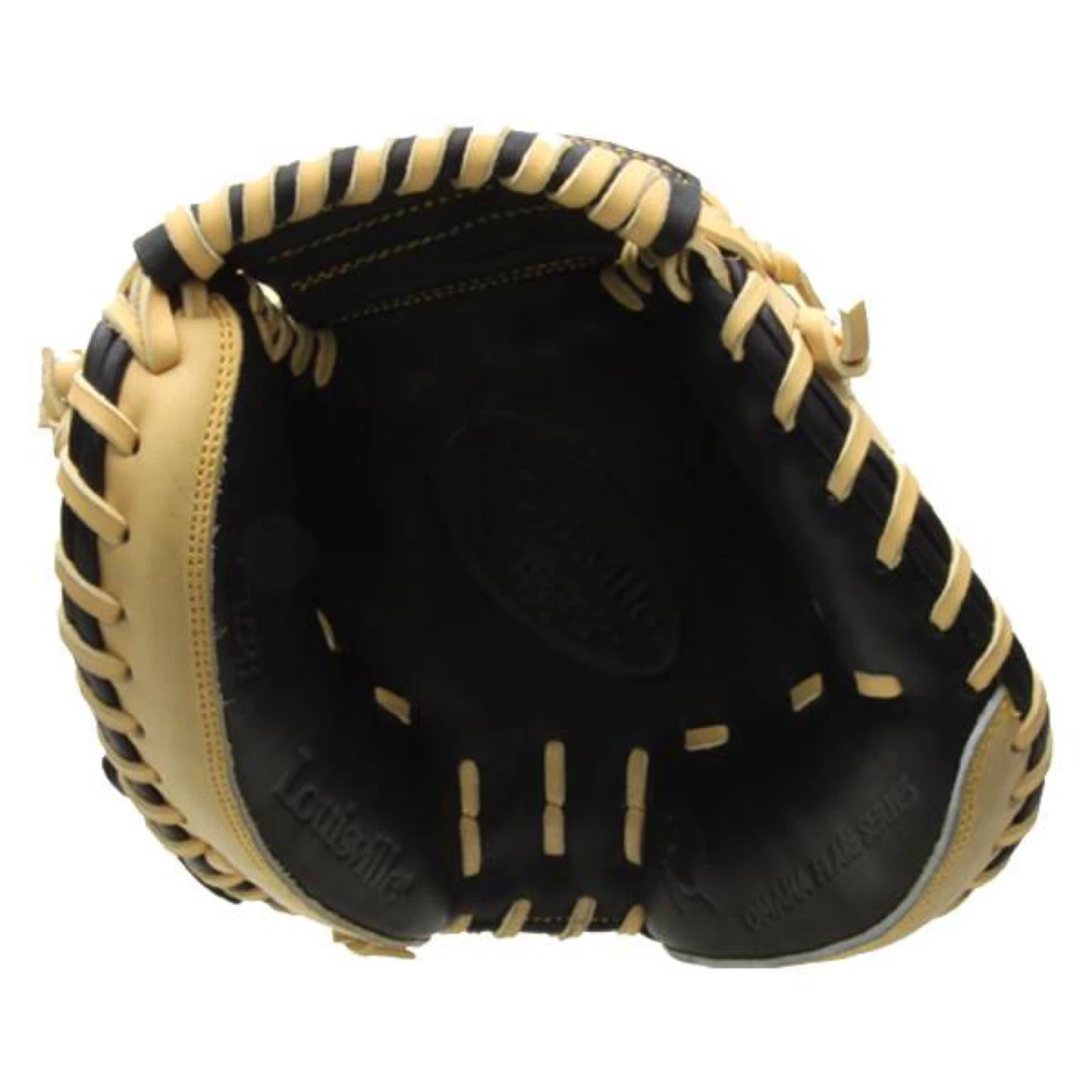 This is a Louisville Slugger Omaha TPX catcher's mitt. It's black and tan leather with yellow stitching. Perfect for catcher for a baseball team!