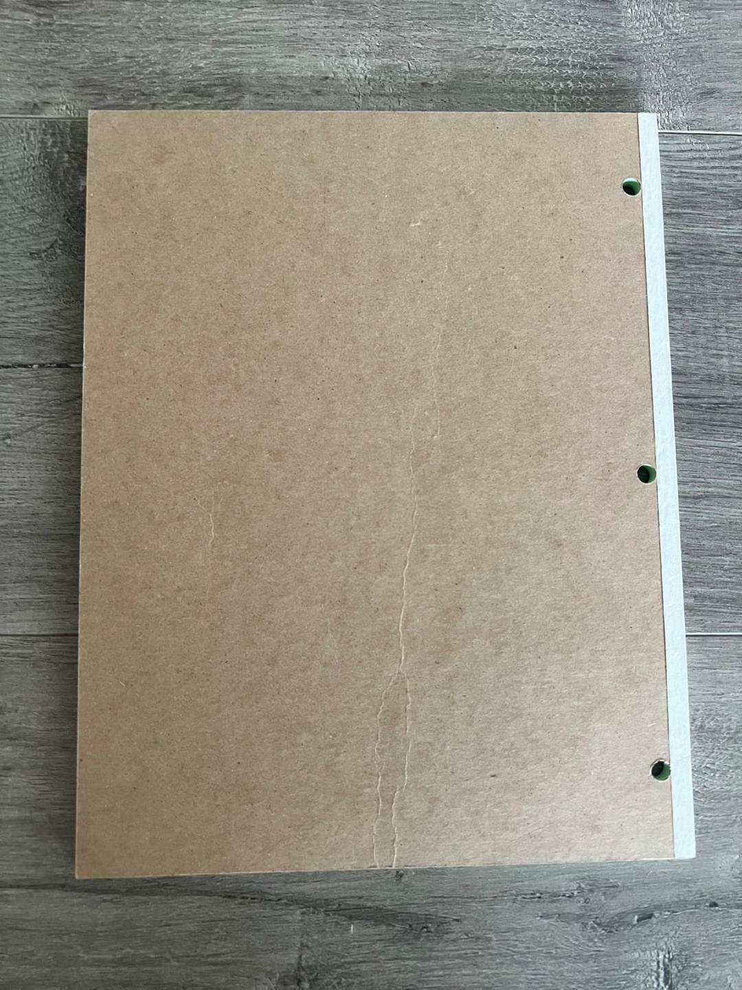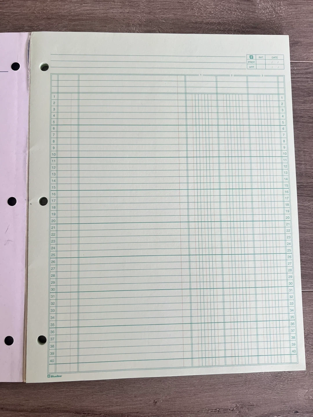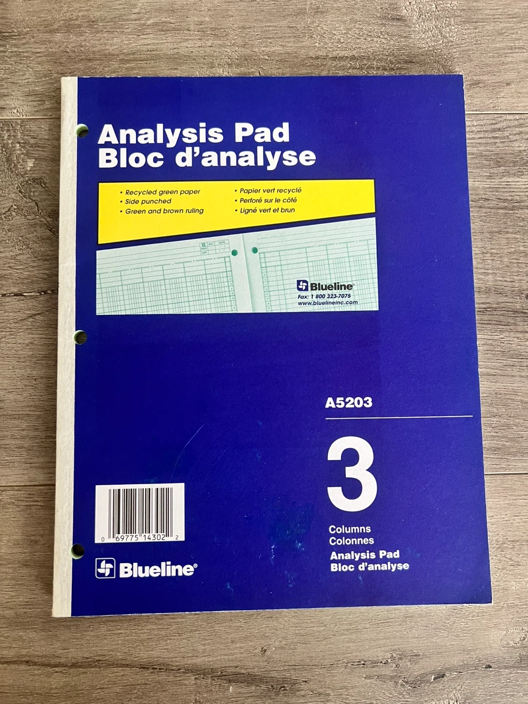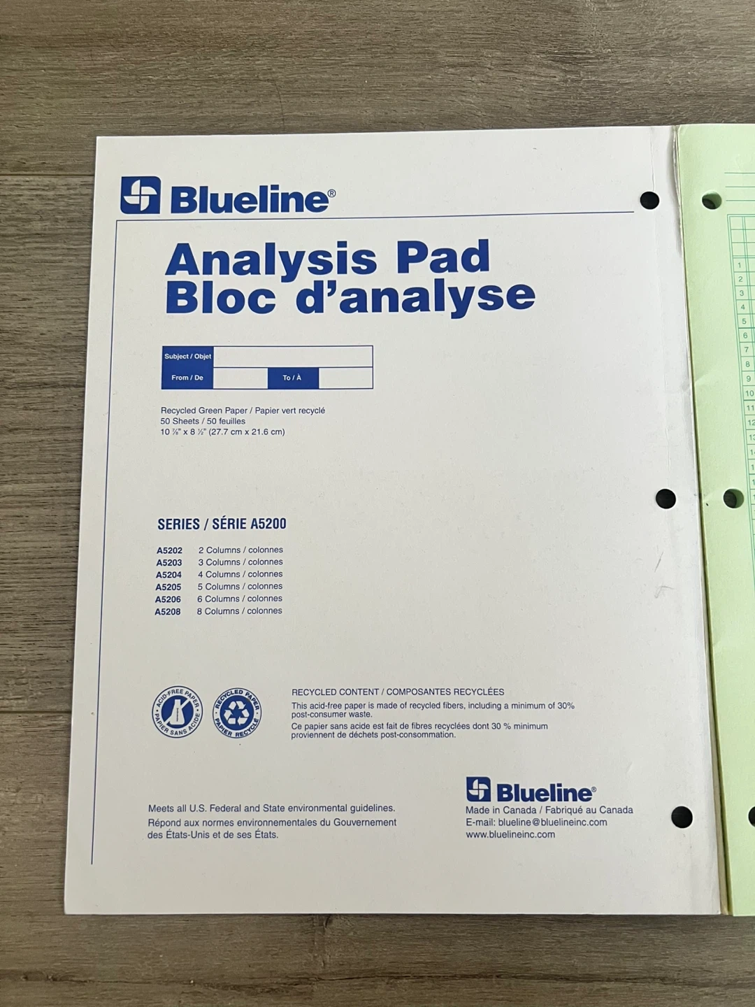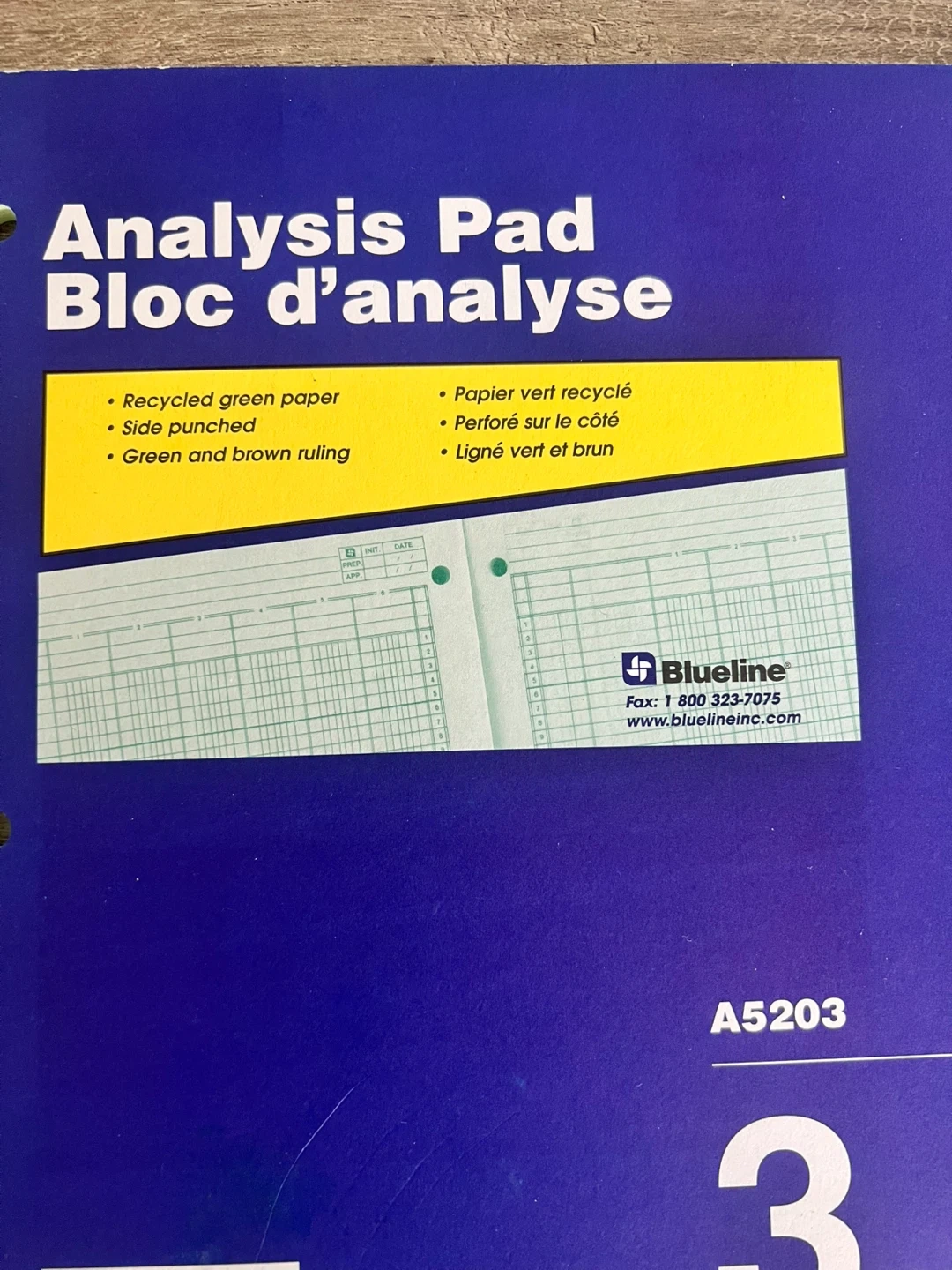 Blueline analysis pad with green paper and side punched holes. It features green and brown ruling for clear organization. This pad is made from recycled fibers, containing a minimum of 30% post-consumer content. It meets U.S. Federal and State environmental guidelines.