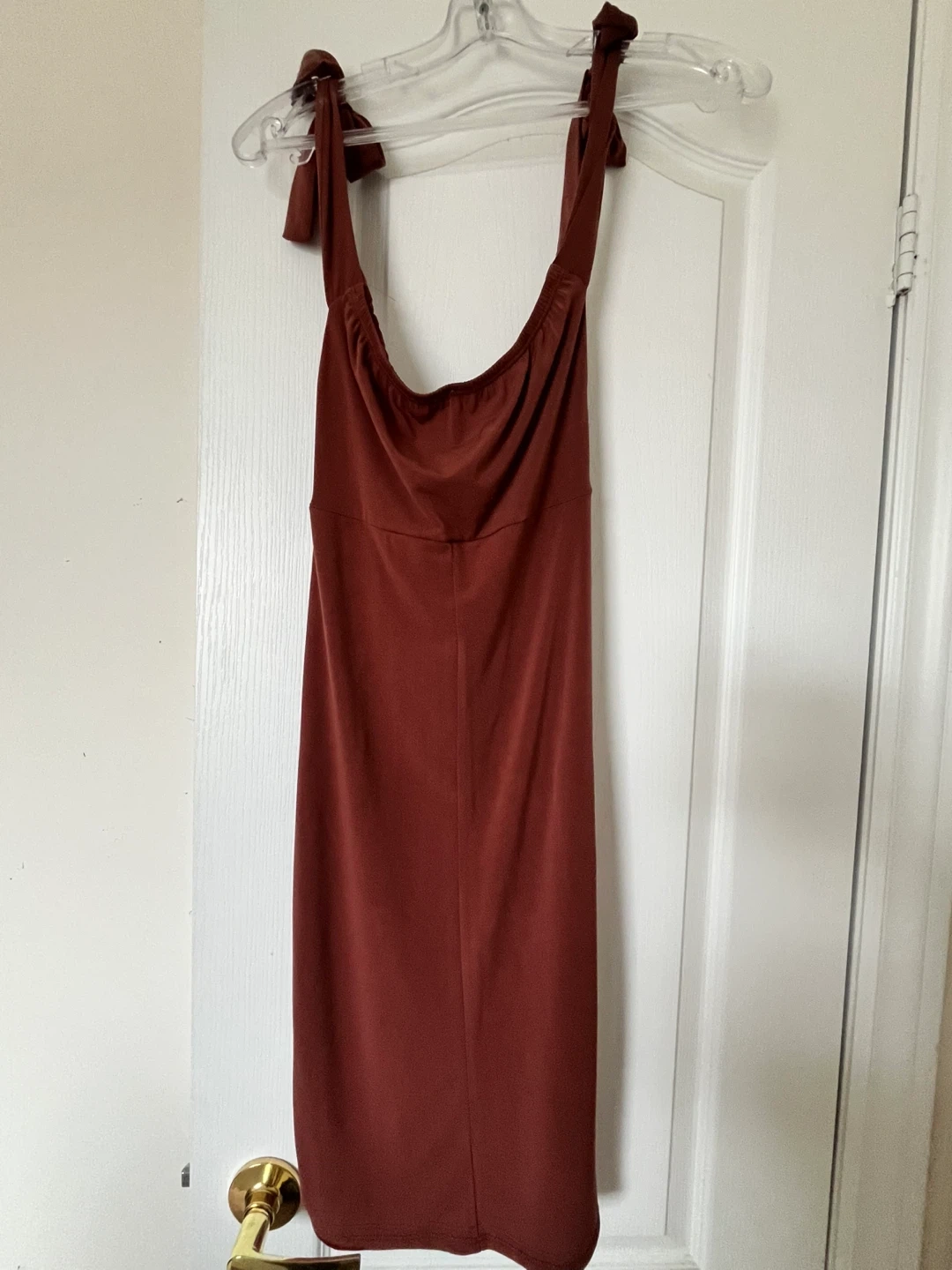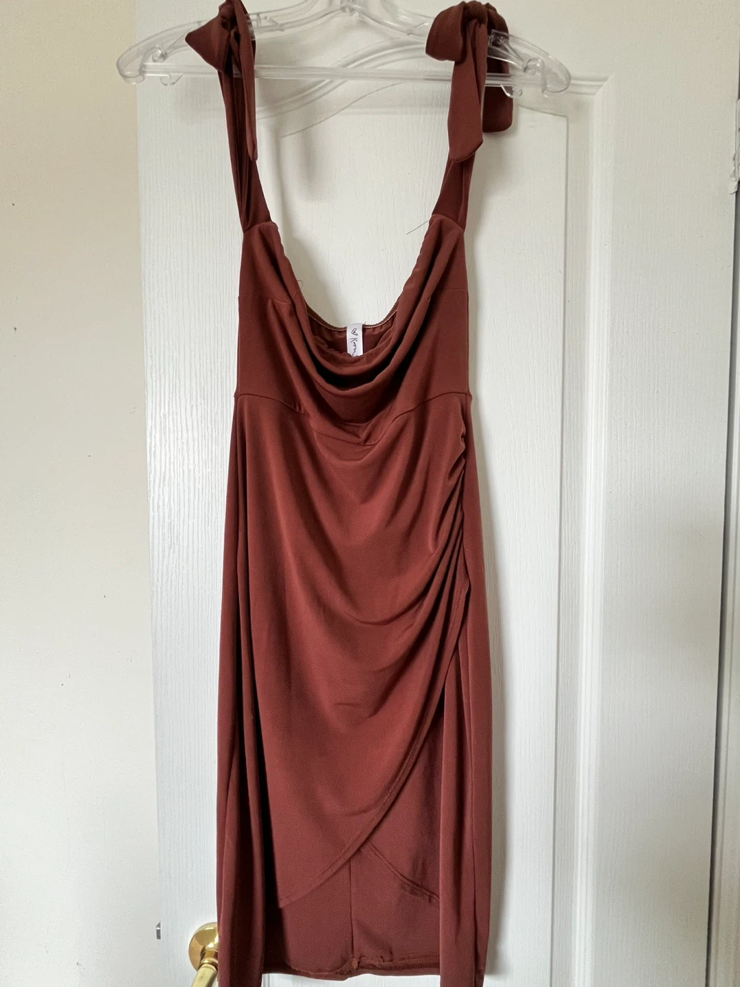 This ruched mini dress comes in a rich brown colour. It features adjustable tie shoulder straps and a flattering draped silhouette. Perfect for a night out!