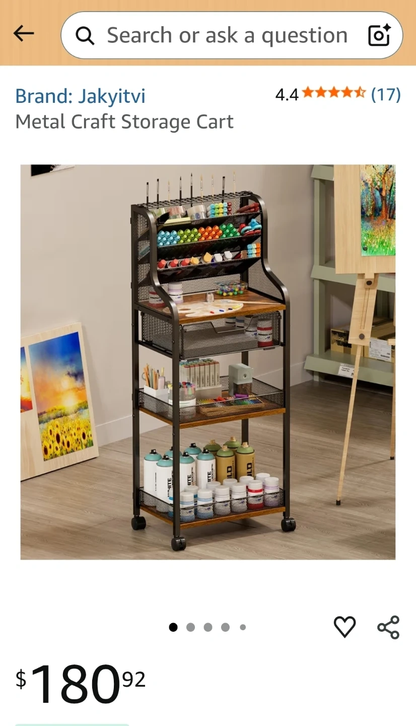 This metal craft storage cart offers great organization for your art supplies. It features multiple tiers, including mesh baskets and drawers, plus dedicated holders for painting brushes. The cart includes 360° lockable wheels for easy mobility. It's perfect for keeping your creative space tidy and all your essentials within reach!