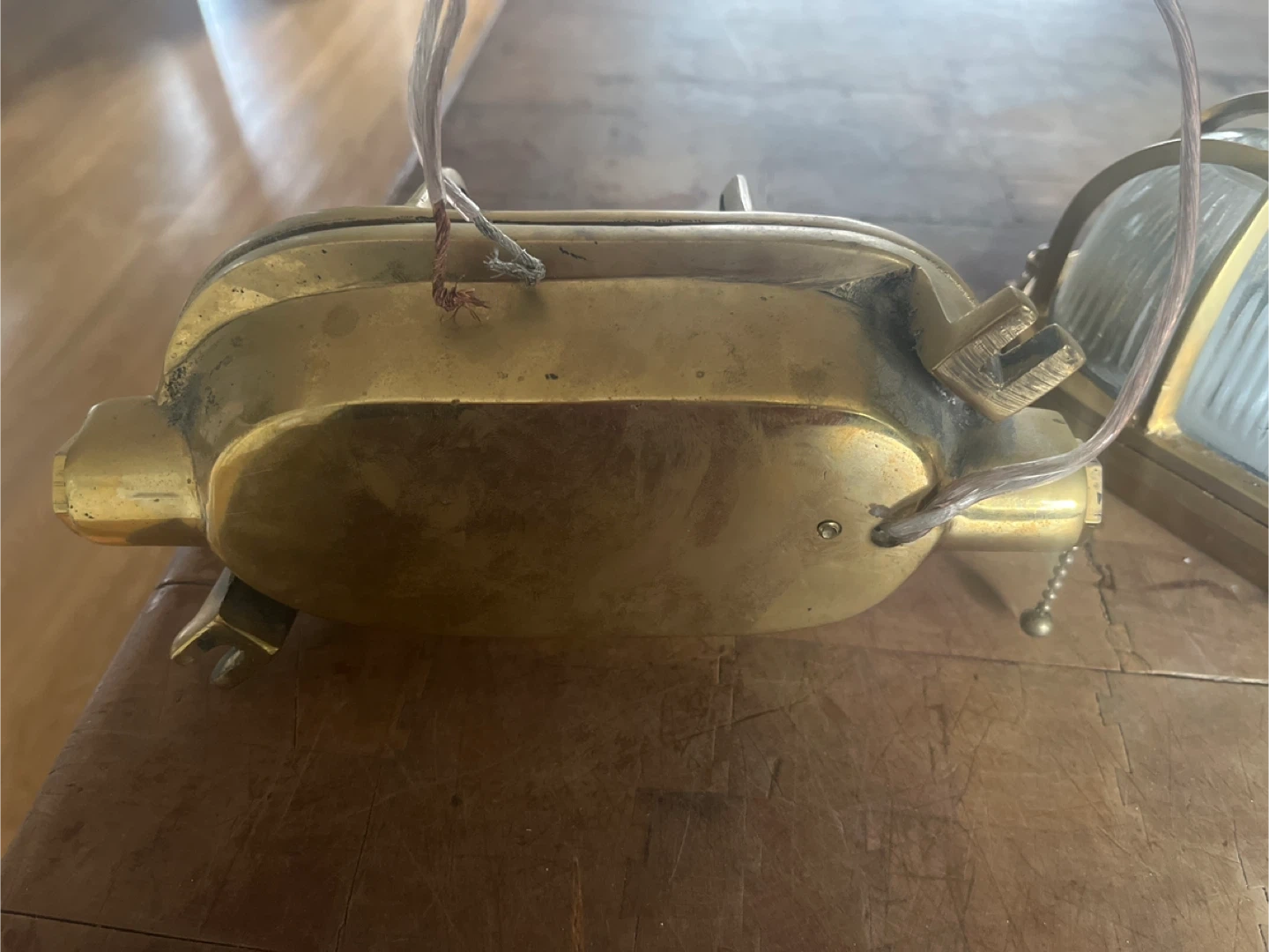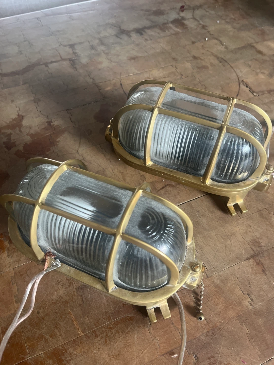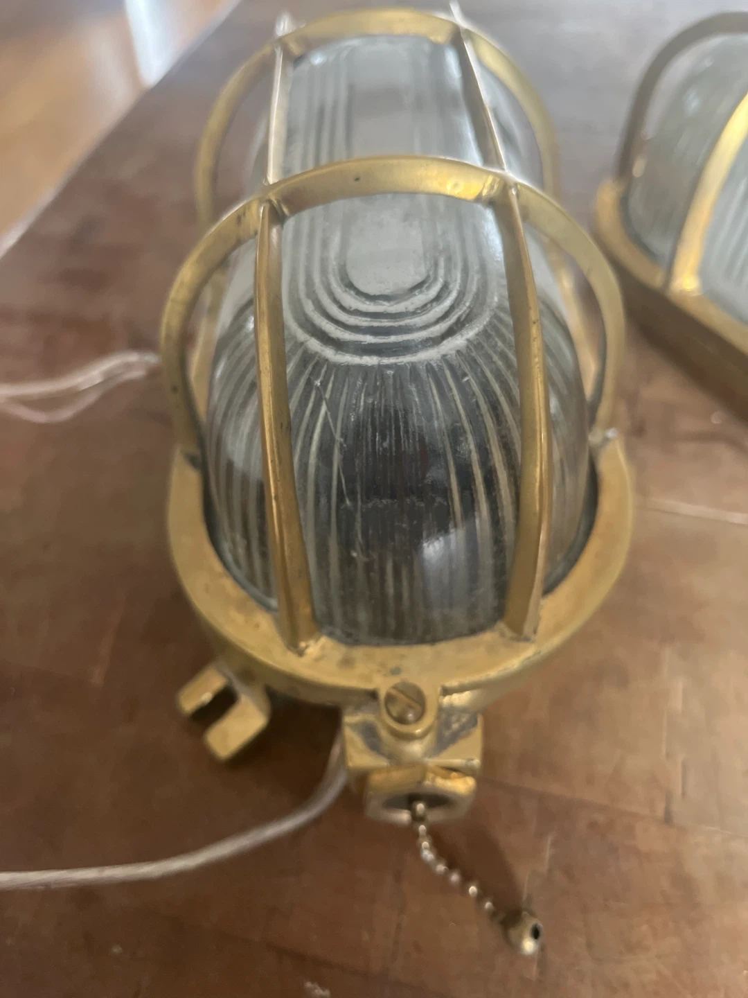 Two vintage bulkhead light fixtures with brass housing and ribbed glass. These lights have pull chains and are ready for wiring. They're a great choice for adding an industrial or nautical touch to your space!