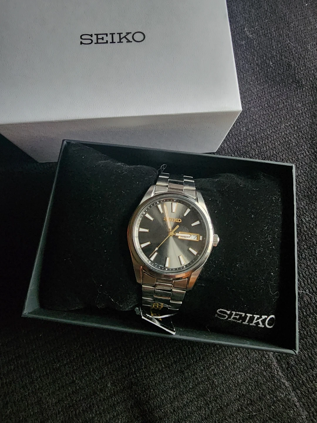 Sleek Design: Features a striking grey sunburst dial with subtle gold-tone highlights and luminous hands and markers for visibility.