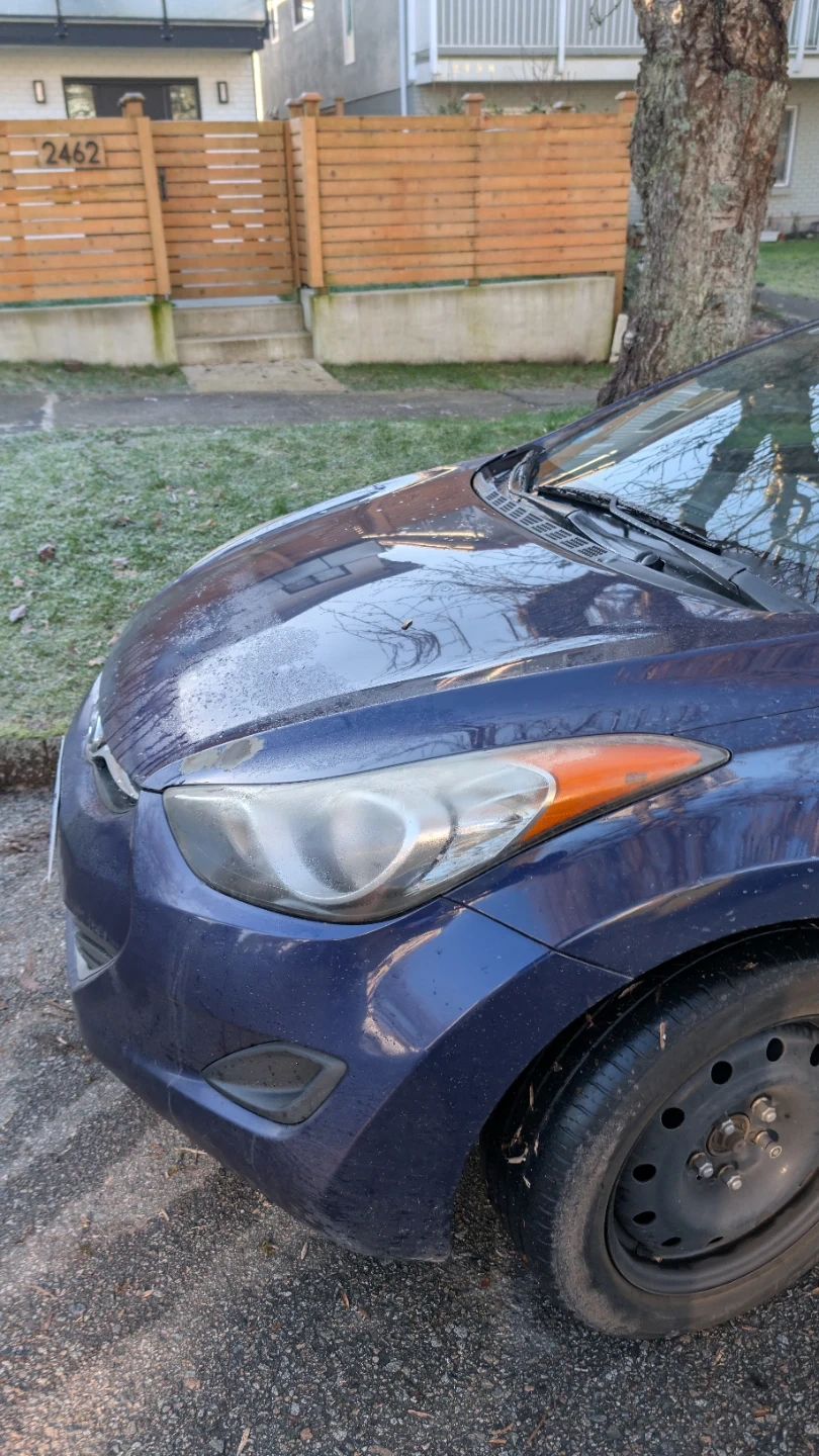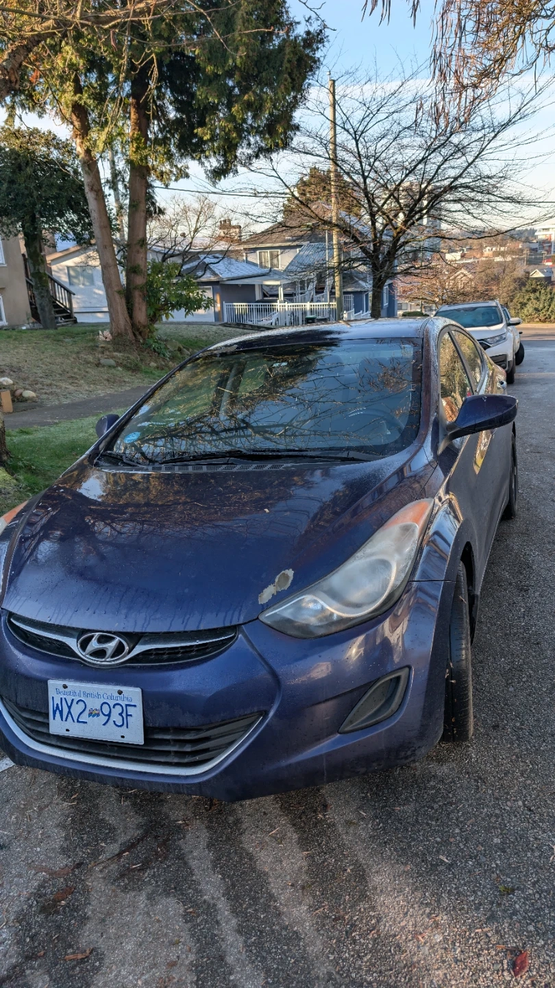 This is a used blue Hyundai Elantra sedan. It's a four-door car. It's been well-used and shows signs of wear. Great for getting around town!