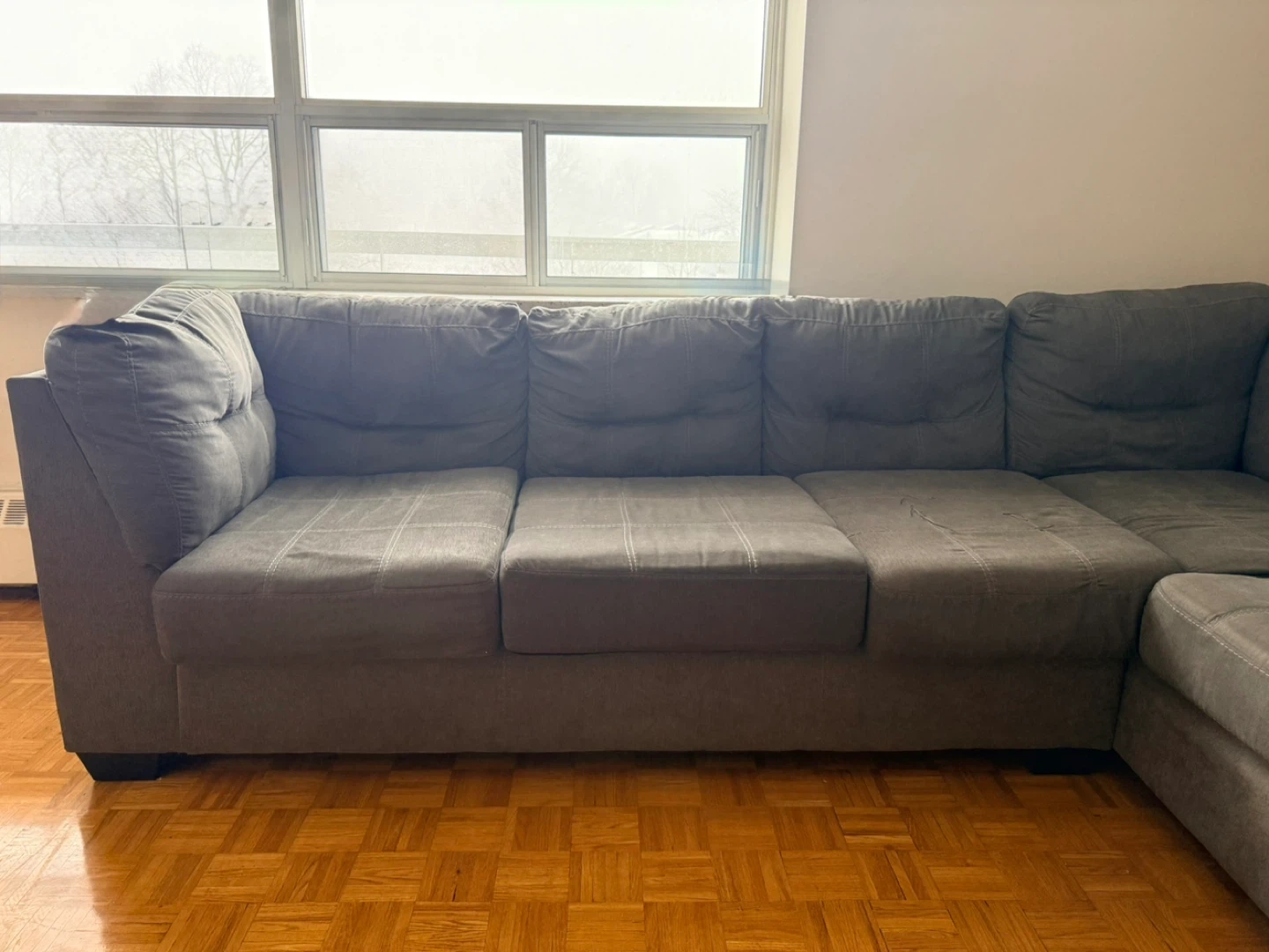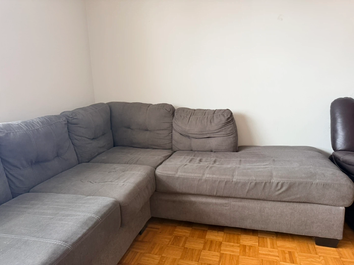 This is a grey sectional sofa with a chaise. It's made of fabric and has tufted cushions. Plenty of seating space for family and friends!