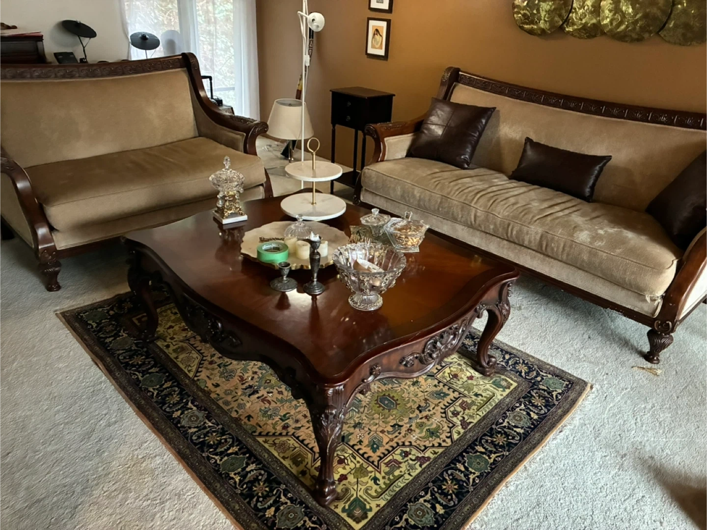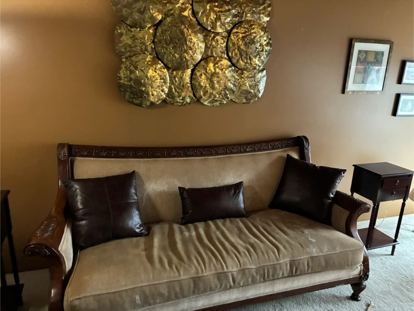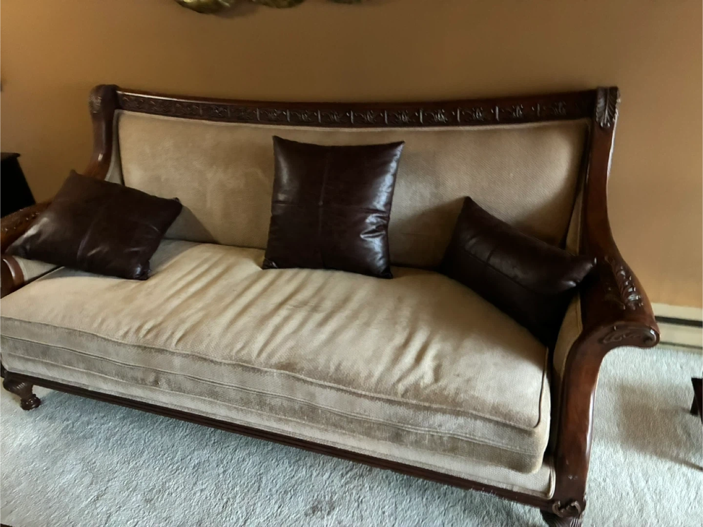 Beautiful vintage sofa featuring a rich wood frame with ornate carvings. It's upholstered in a neutral beige fabric and comes with three dark brown throw pillows. This sofa offers timeless style and comfortable seating.