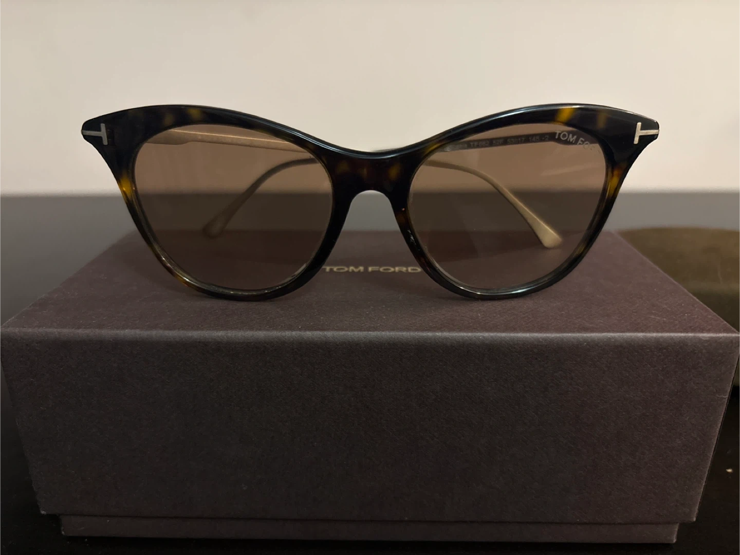 Tom Ford cat-eye sunglasses in a tortoiseshell pattern. They're in a brown suede case with a matching box. Includes a cleaning cloth. Includes authenticity card. Style TF662.
