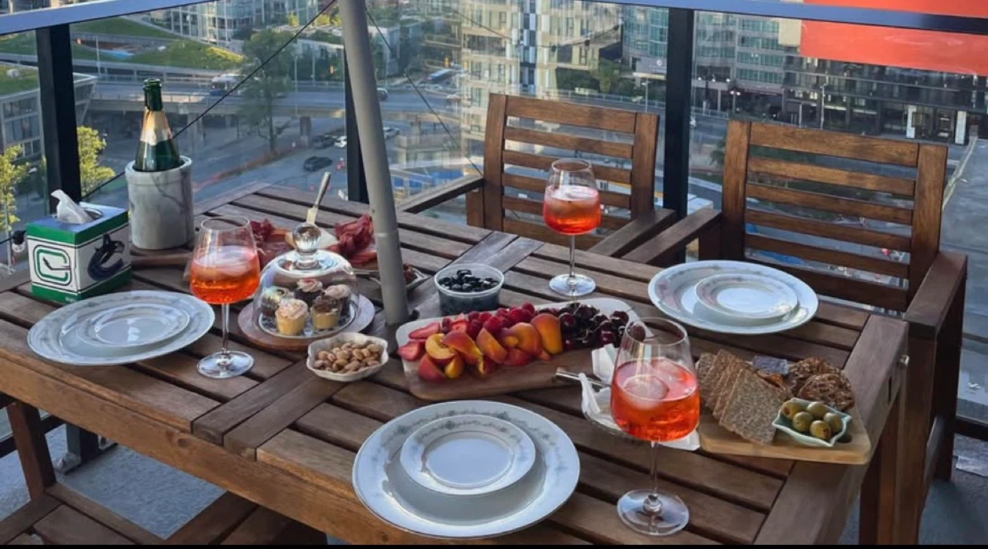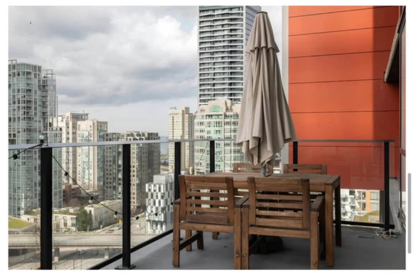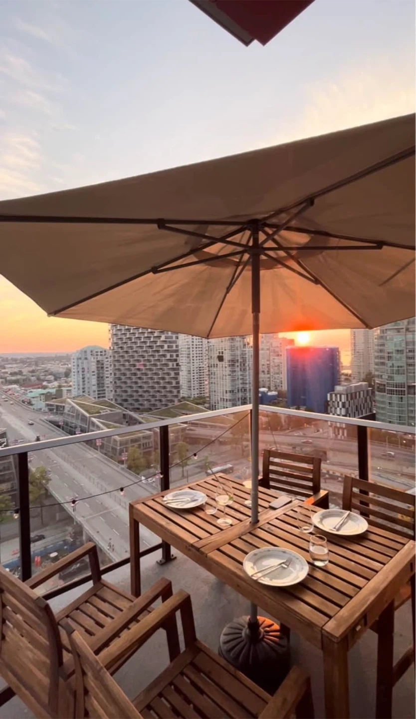 Solid wood dining set perfect for your patio or balcony. Includes a table and four chairs. An umbrella is also included to provide shade on sunny days. Great for enjoying outdoor meals and entertaining guests!