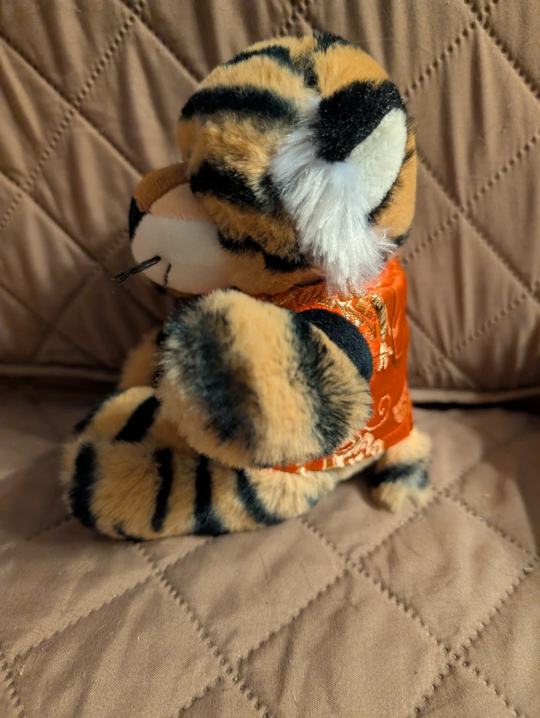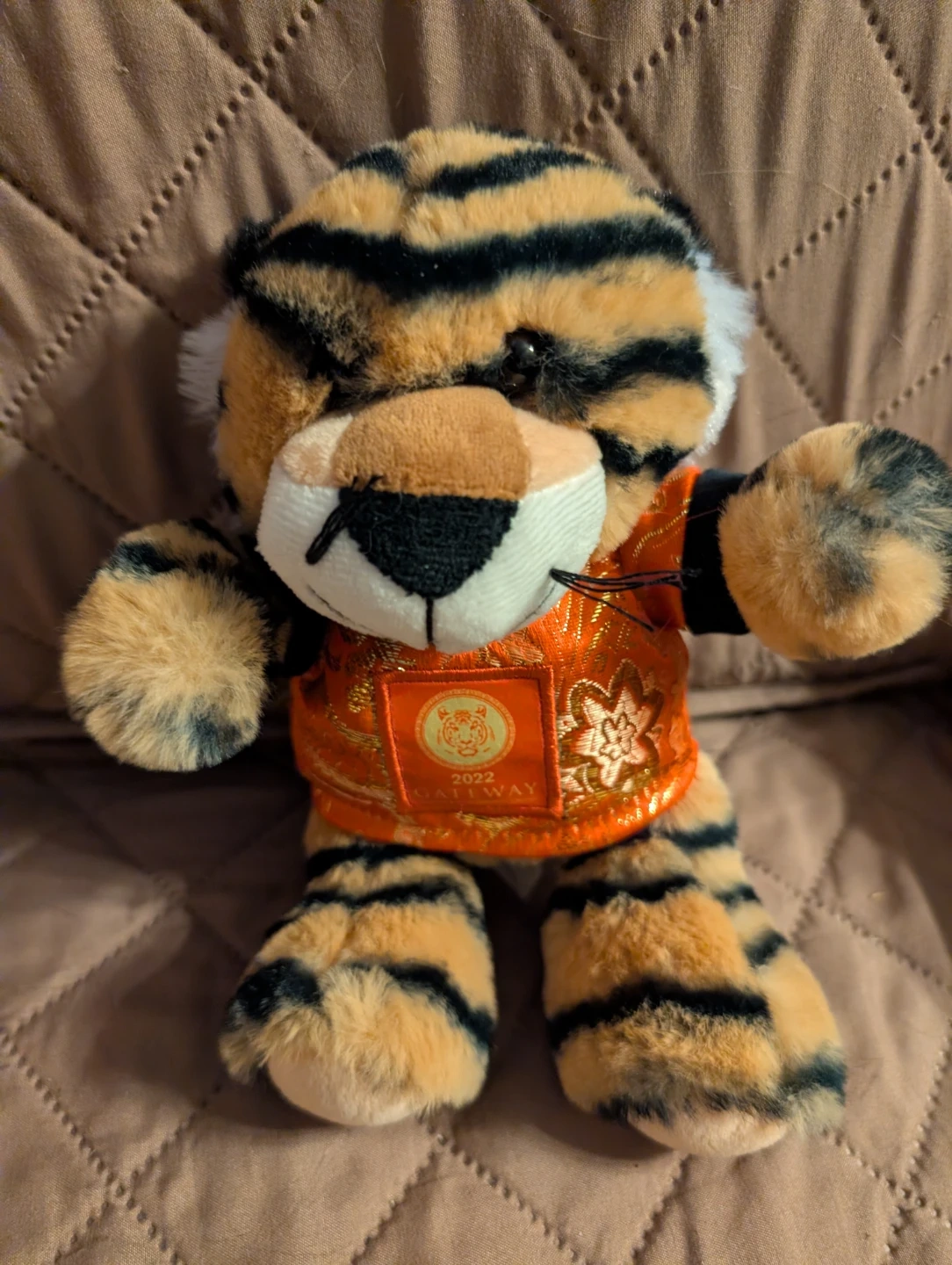This is a soft plush tiger toy from Gateway, celebrating the 2022 Year of the Tiger. It's wearing an ornate orange vest with gold detailing. A great collectible item!