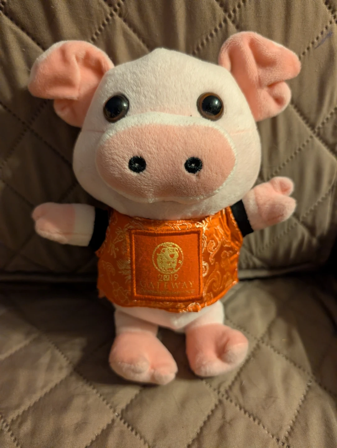This is a soft plush pig toy wearing a festive orange and gold vest. The vest has "2019 GATEWAY" printed on it. It's a cute collectible item from 2019. This would make a sweet gift for someone who loves pigs or for a collector!