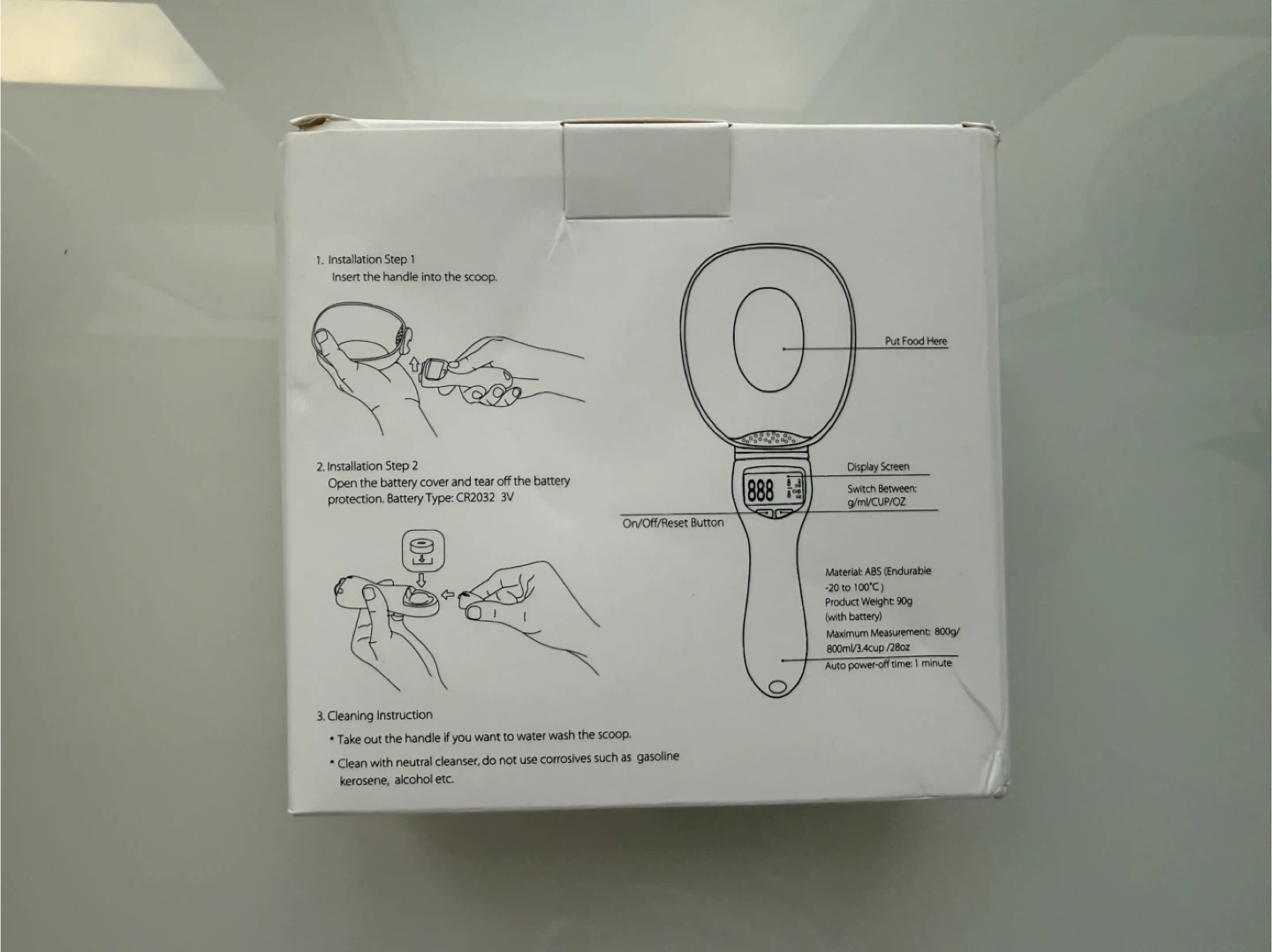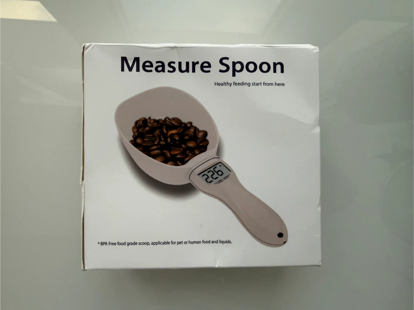 This digital measuring spoon is BPA-free and food-grade, suitable for pet or human food and liquids. It has a maximum capacity of 800g/800ml (28oz) and features a switch between grams, ml, cups, and oz. The scoop has a temperature range of -20 to 100°C and an auto power-off function after one minute. It's great for precise ingredient measurements in the kitchen or for pet food portions!