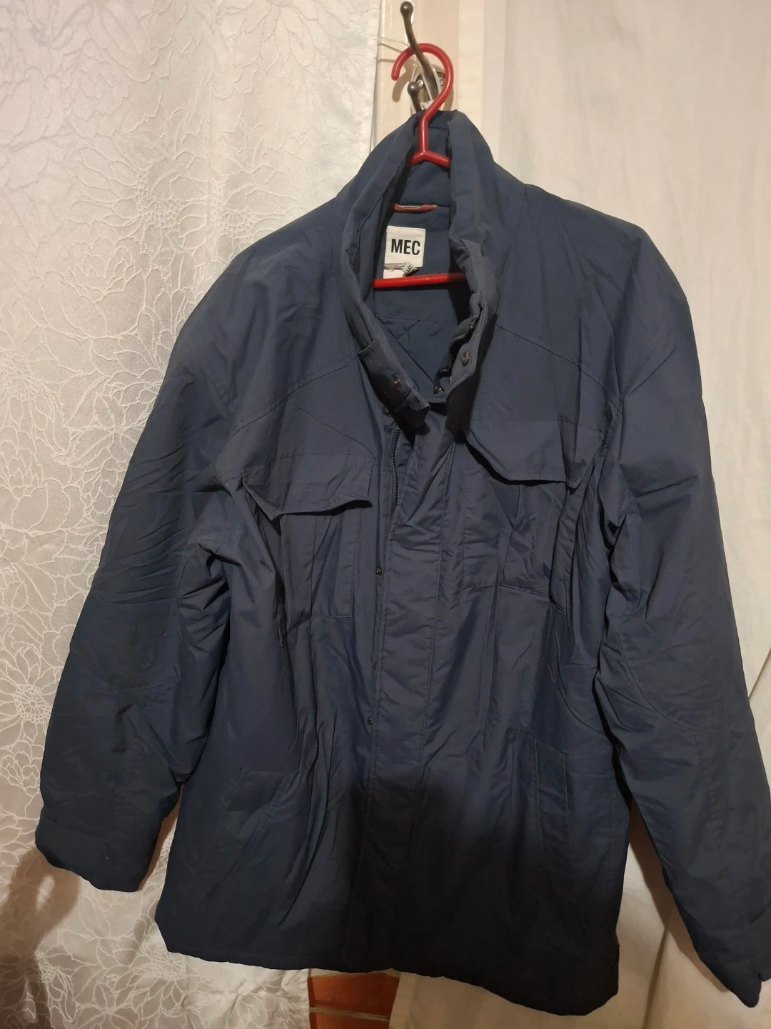 This is a MEC navy blue winter jacket. It's a men's size large. Made for warmth and durability, it features a full zip closure and multiple pockets.