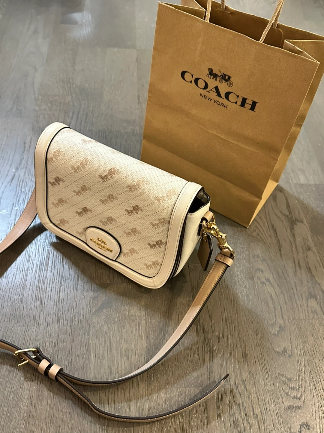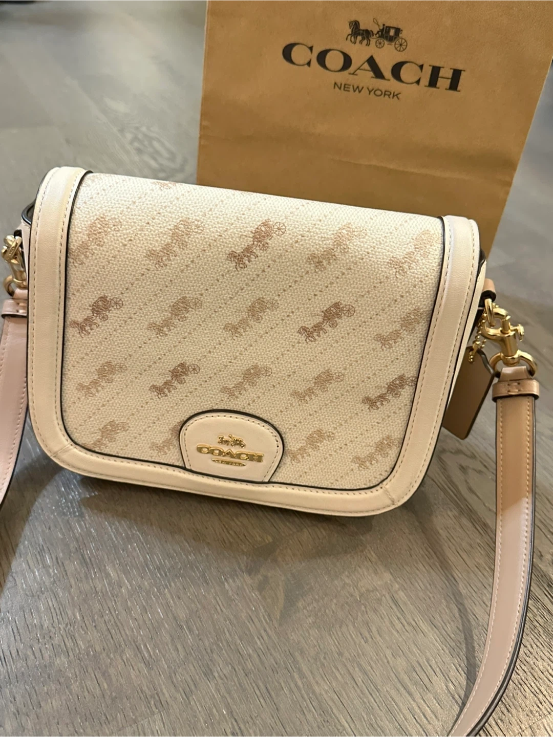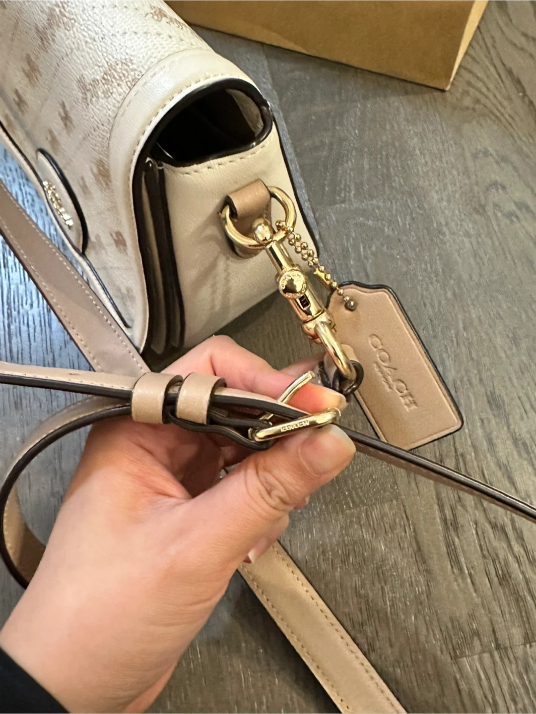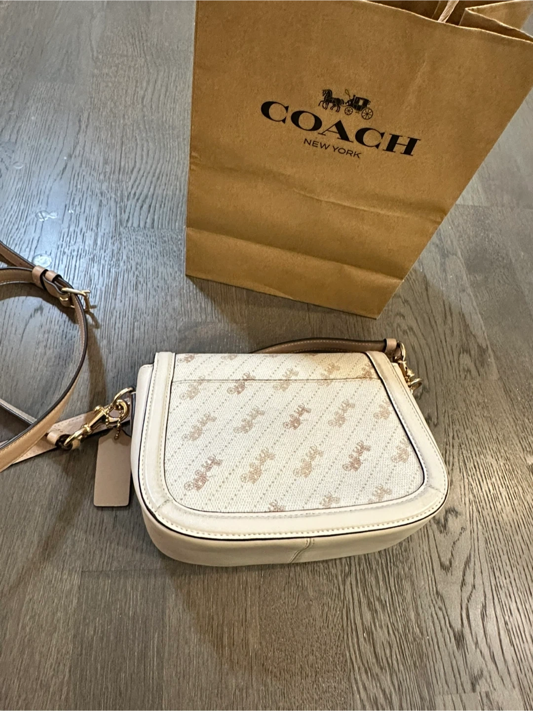 This is a Coach shoulder bag with the signature carriage pattern. It's made with leather and has a light beige color. Includes adjustable strap and Coach bag.