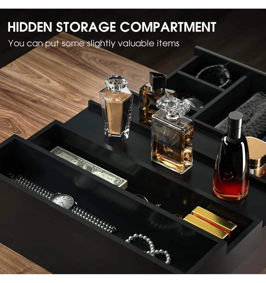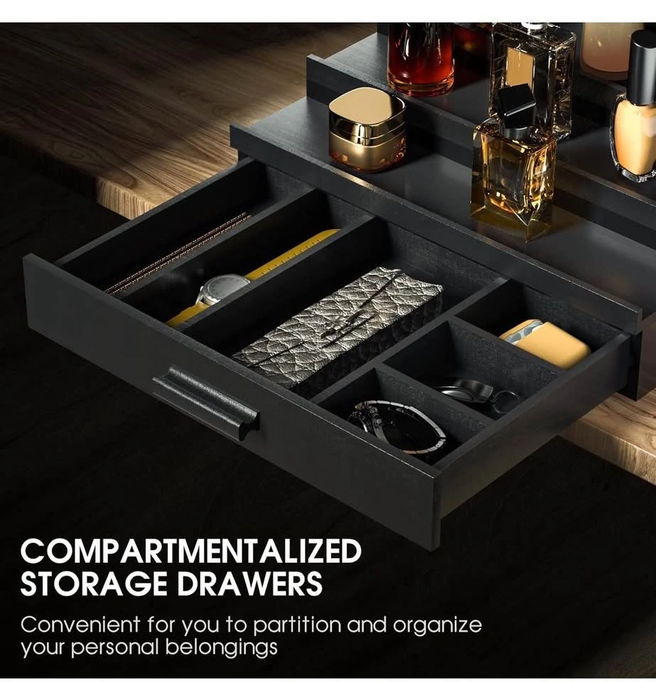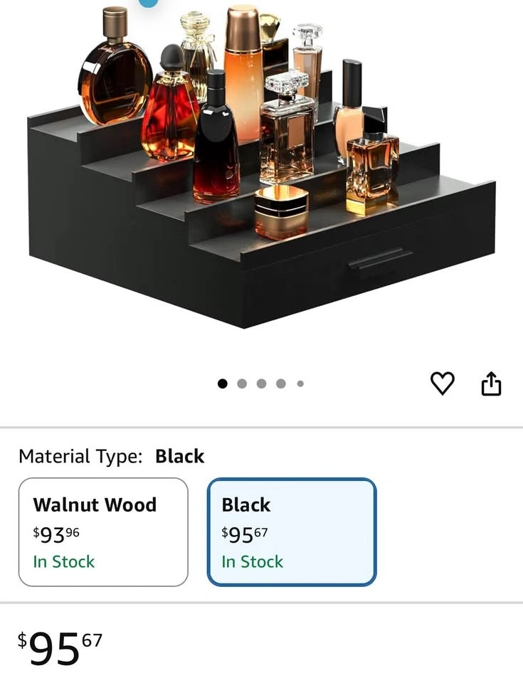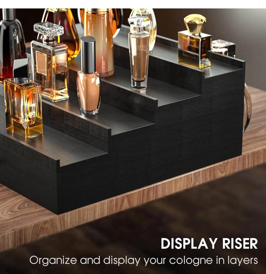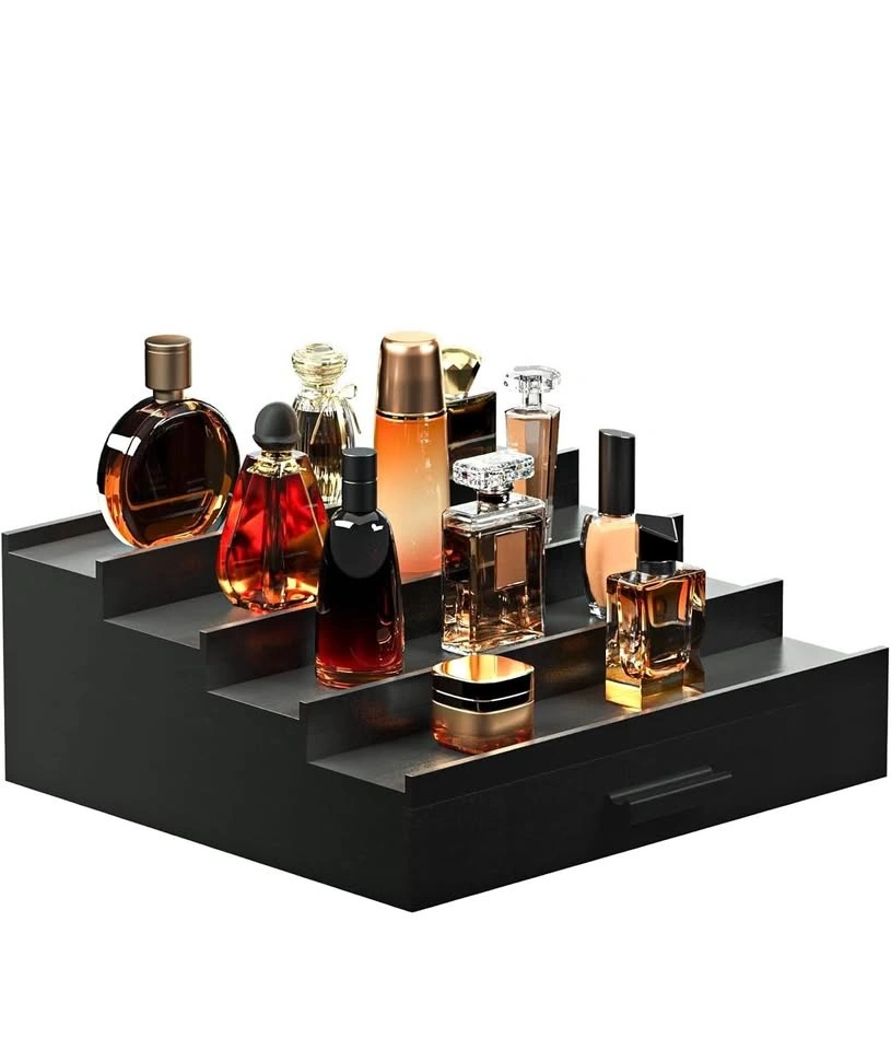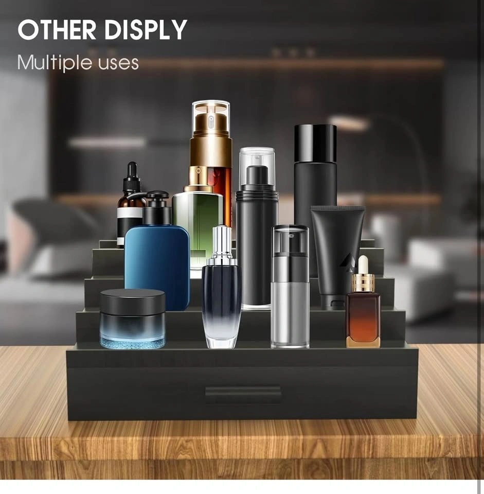 Sleek black tiered display organizer for your perfumes and makeup. Has a handy pull-out drawer with compartments for jewelry, watches, or other small items, plus a hidden storage spot. Measures about 12.6" L x 11.5" D x 5.5" H. Great for keeping your vanity tidy!