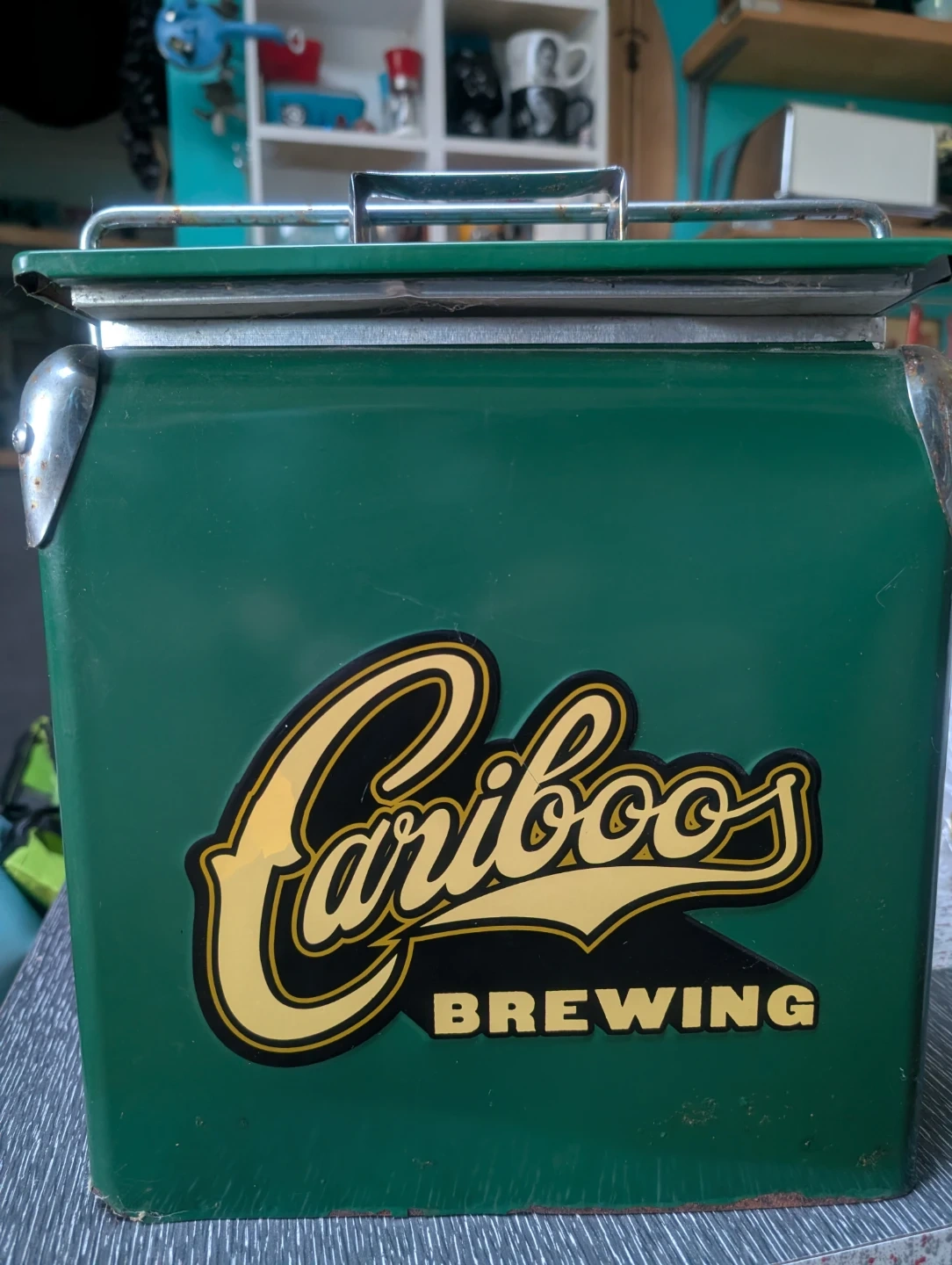 Vintage Cariboo's Brewing cooler. It's green with the classic Cariboo's logo. This metal cooler is perfect for camping trips or collecting! As is condition. Needs to be cleaned up.