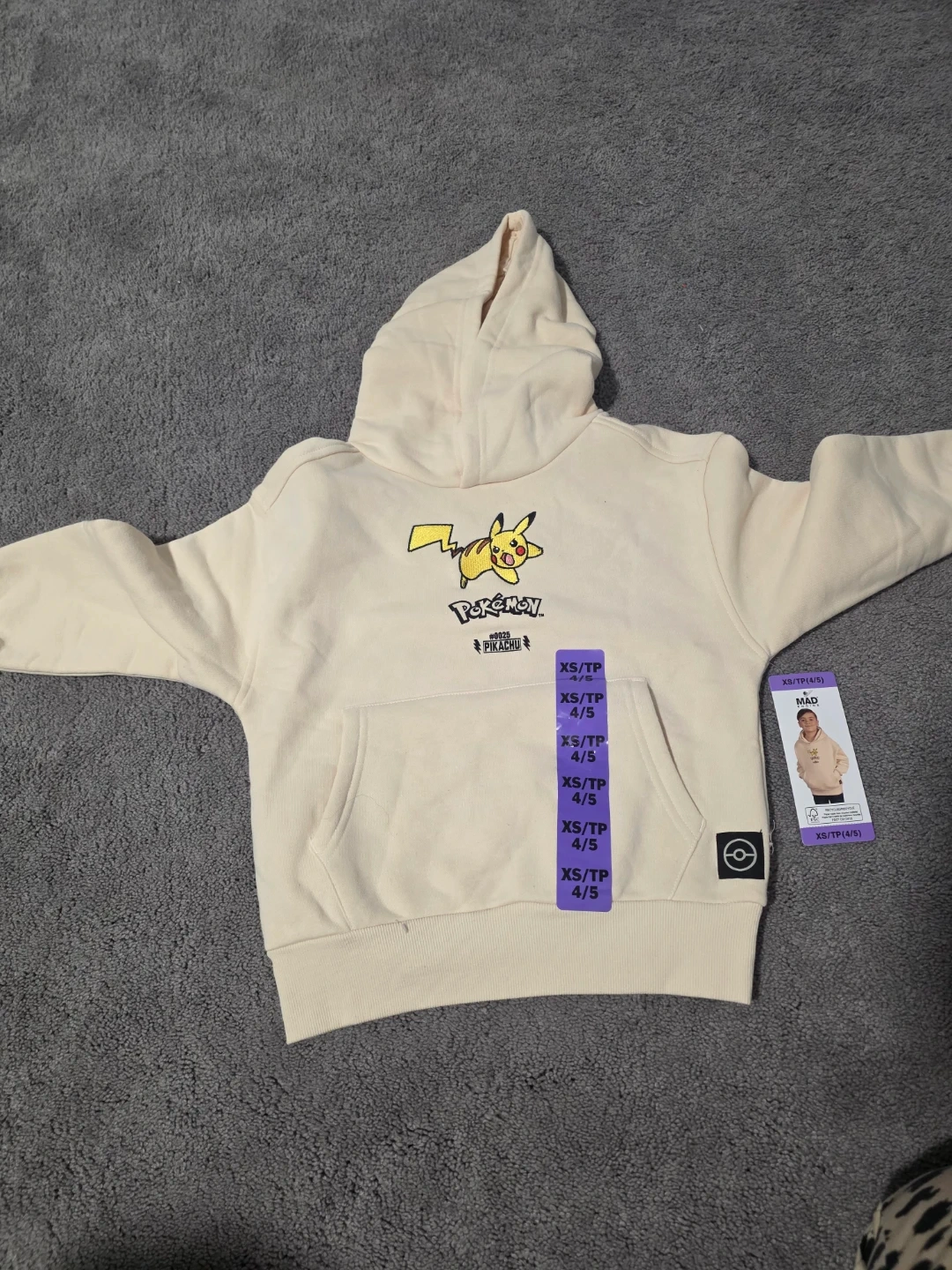 Cream-coloured Pokémon hoodie with a Pikachu graphic. It's size XS/TP, suitable for ages 4-5. The hoodie is made of a soft material, perfect for everyday wear.