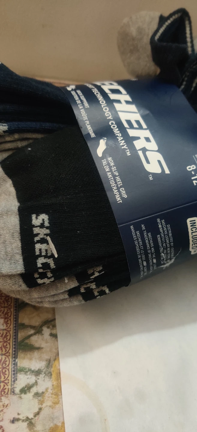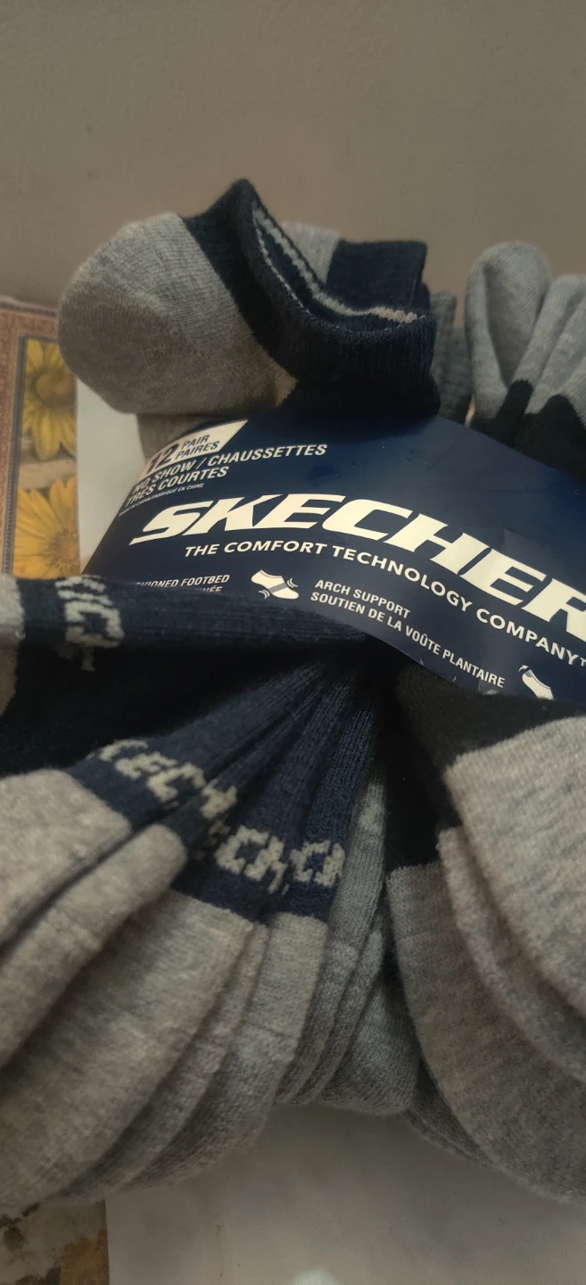 This is a 12-pair pack of Skechers men's no-show socks. Shoe size 8-12. They're designed with a non-slip heel grip and arch support. Features a cushioned footbed and comfort toe.Can be worn by male or female