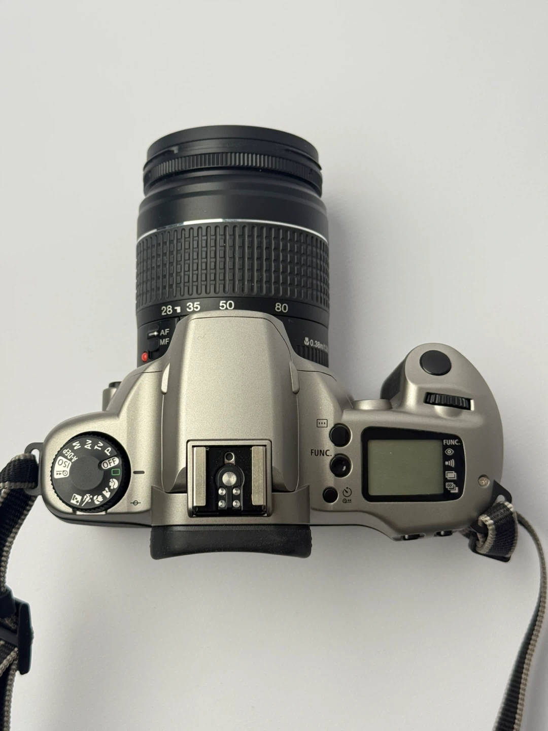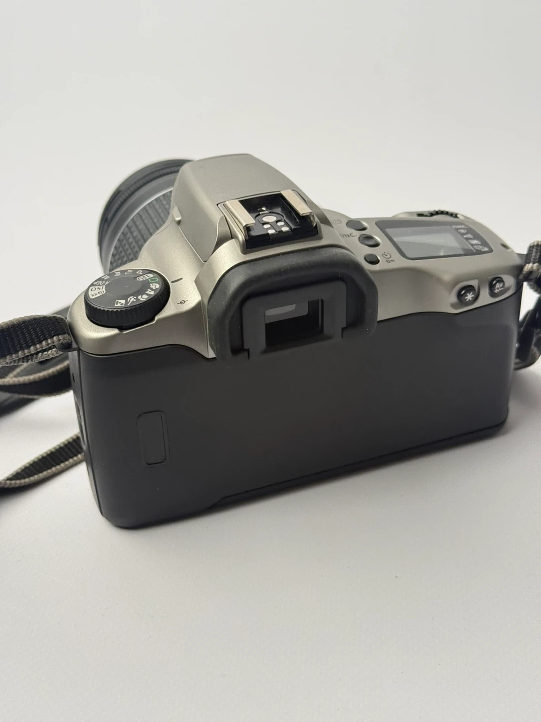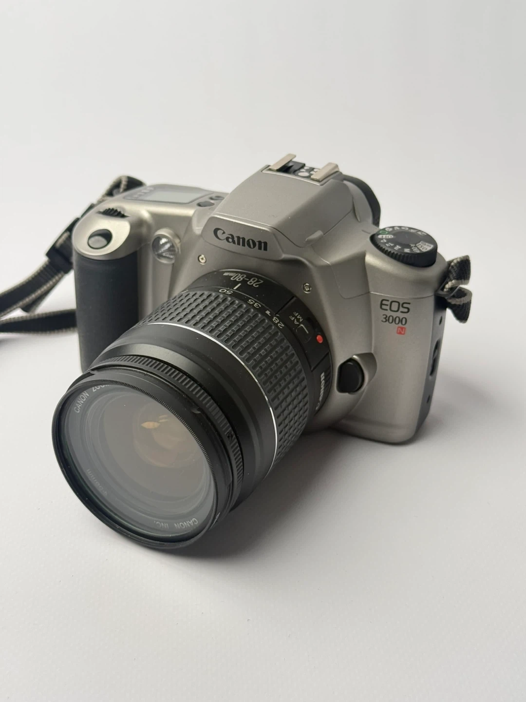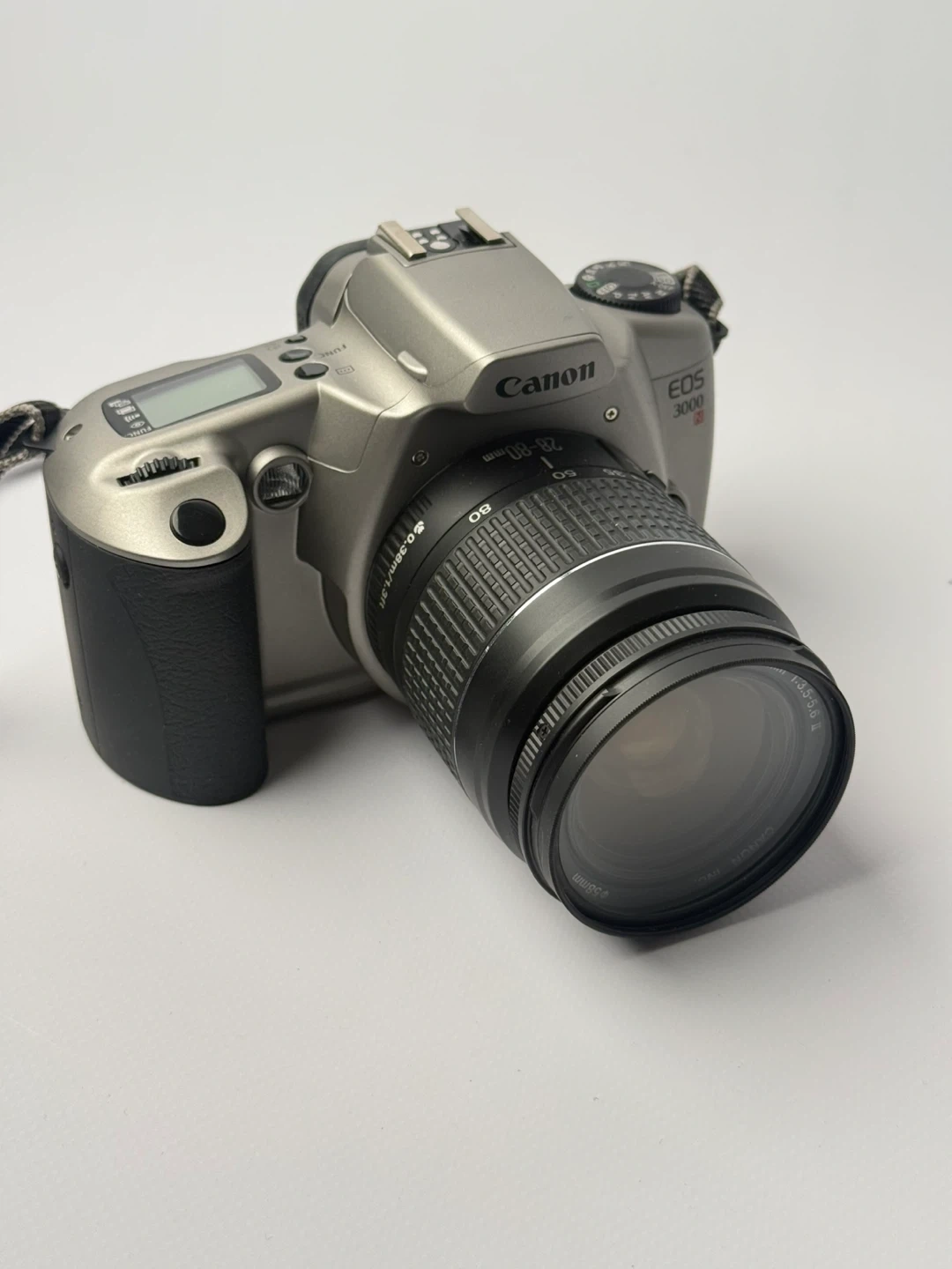 This is a Canon EOS 3000 35mm film camera with a Canon zoom lens. It's a great entry-level SLR for film photography enthusiasts. The camera has a silver and black finish. It's ready to capture your moments!