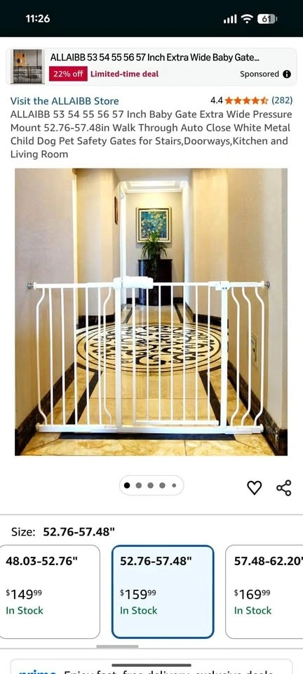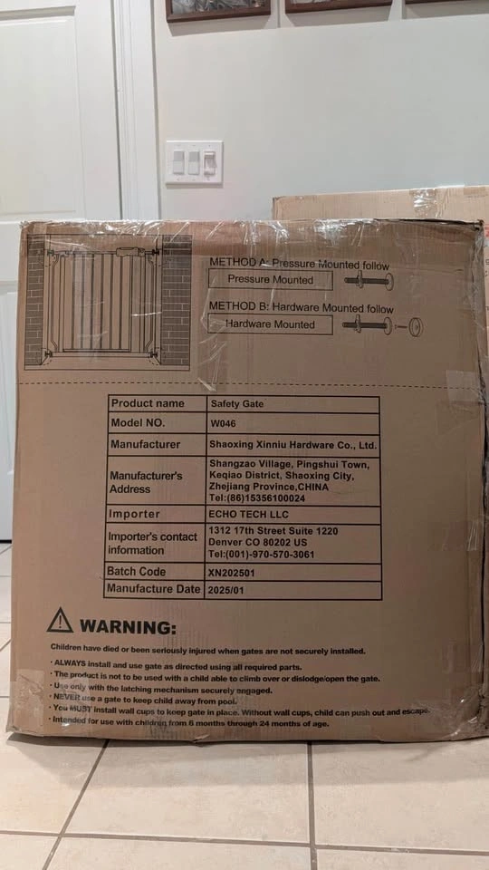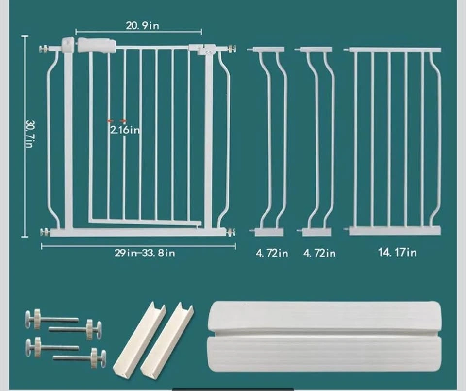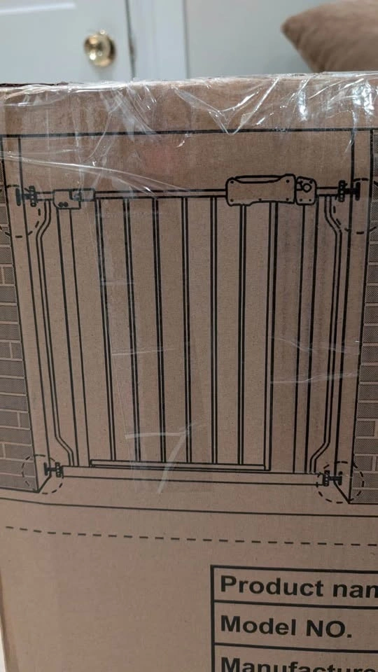 New, still in box. Pressure mounted baby gate, auto-close feature, opens from both sides. Includes a Hold Open feature. Made of durable steel, sturdy enough to bear 180 pounds. Double-lock safety release is difficult for toddlers to open but easy for adults to use with one hand. Fits openings from 52.76-57.48 inches. Can be extended for wider spaces (24.2 to 76.4 inches). Easy 5-minute installation without drilling. Feel free to message if you have any questions!