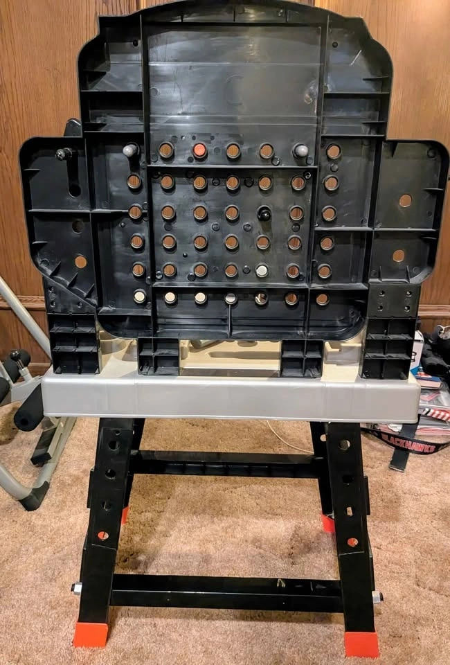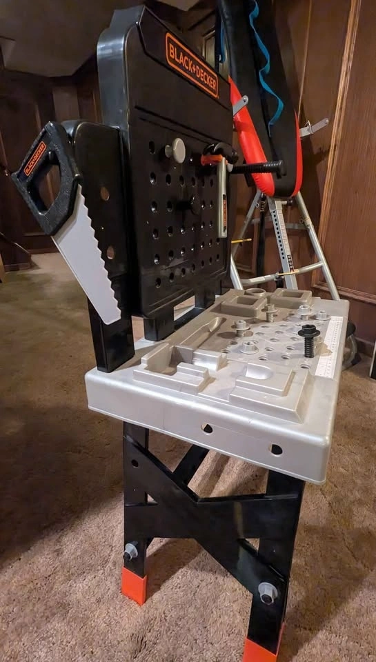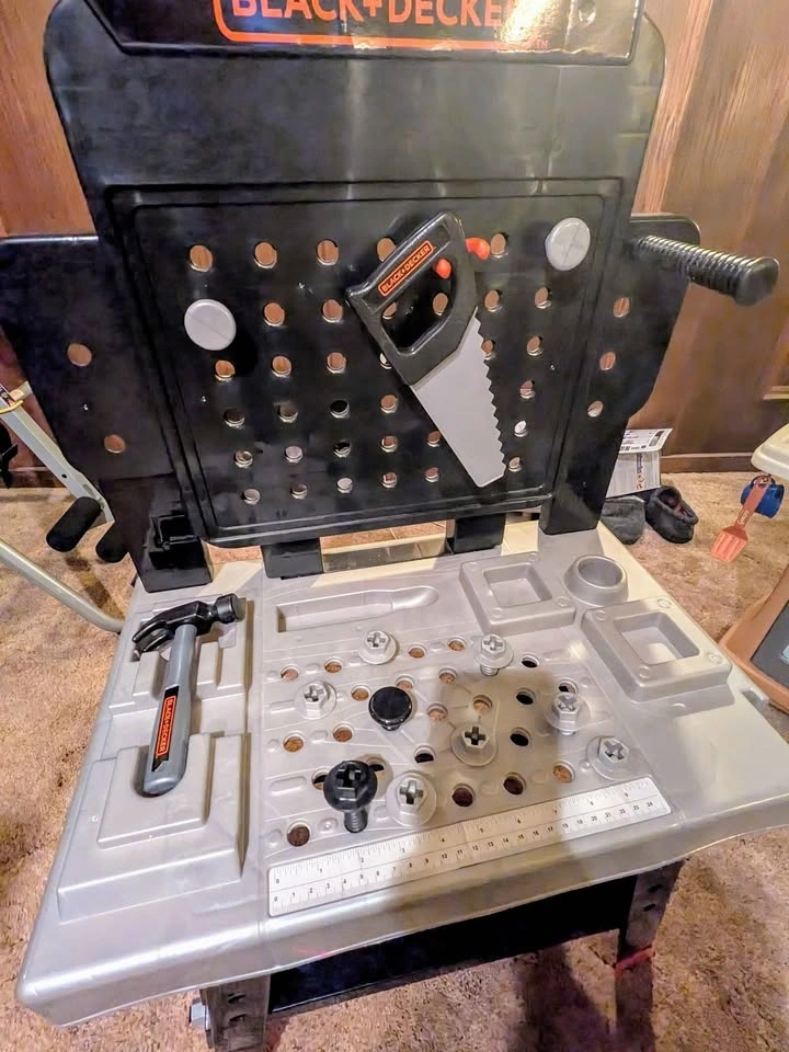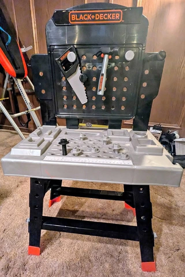 Black and Decker kids tool work bench for imaginative play. Good condition. Most of the actual tools have disappeared, which is why it's priced so low. Amazon and Temu sell replacements cheaply. Still includes bolts, screws, hammer, and saw. Porch pickup and cash only. If you see this ad, it's available.