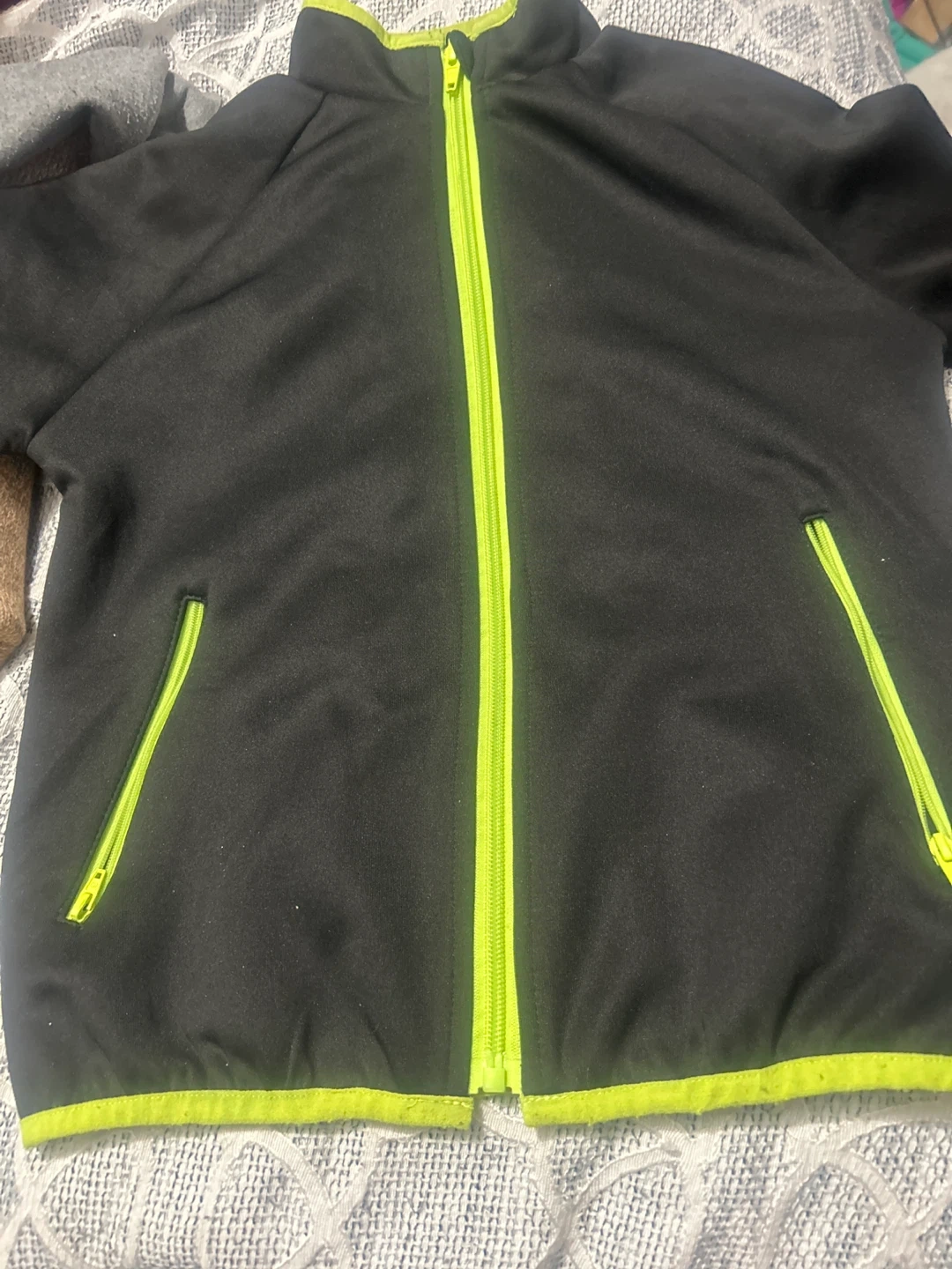 This black track jacket features bright neon green zippers and trim. It has two zippered pockets.