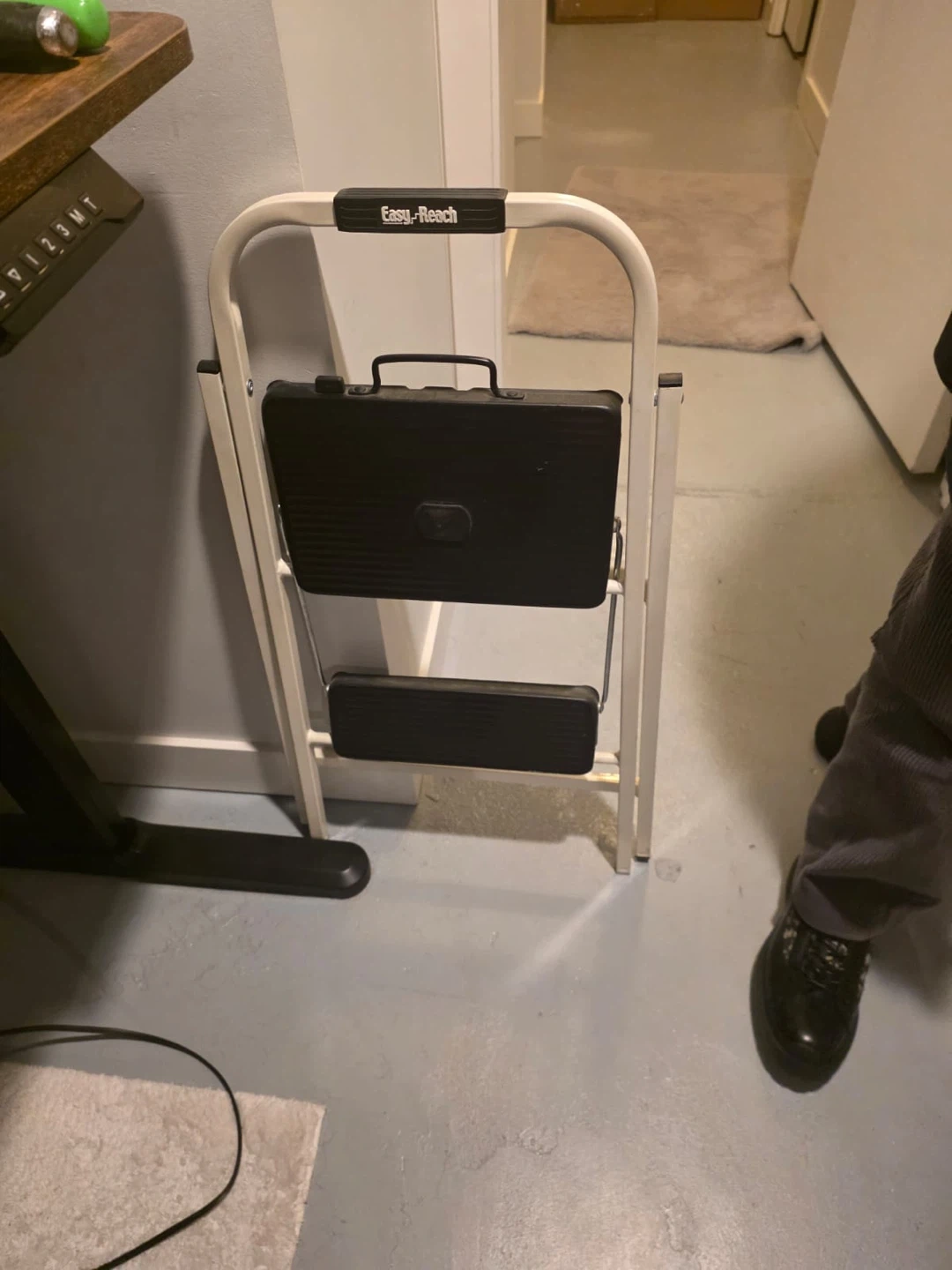 This is a white Easy-Reach folding step stool with black steps. It's designed for convenient storage and easy access. Perfect for reaching those higher shelves!