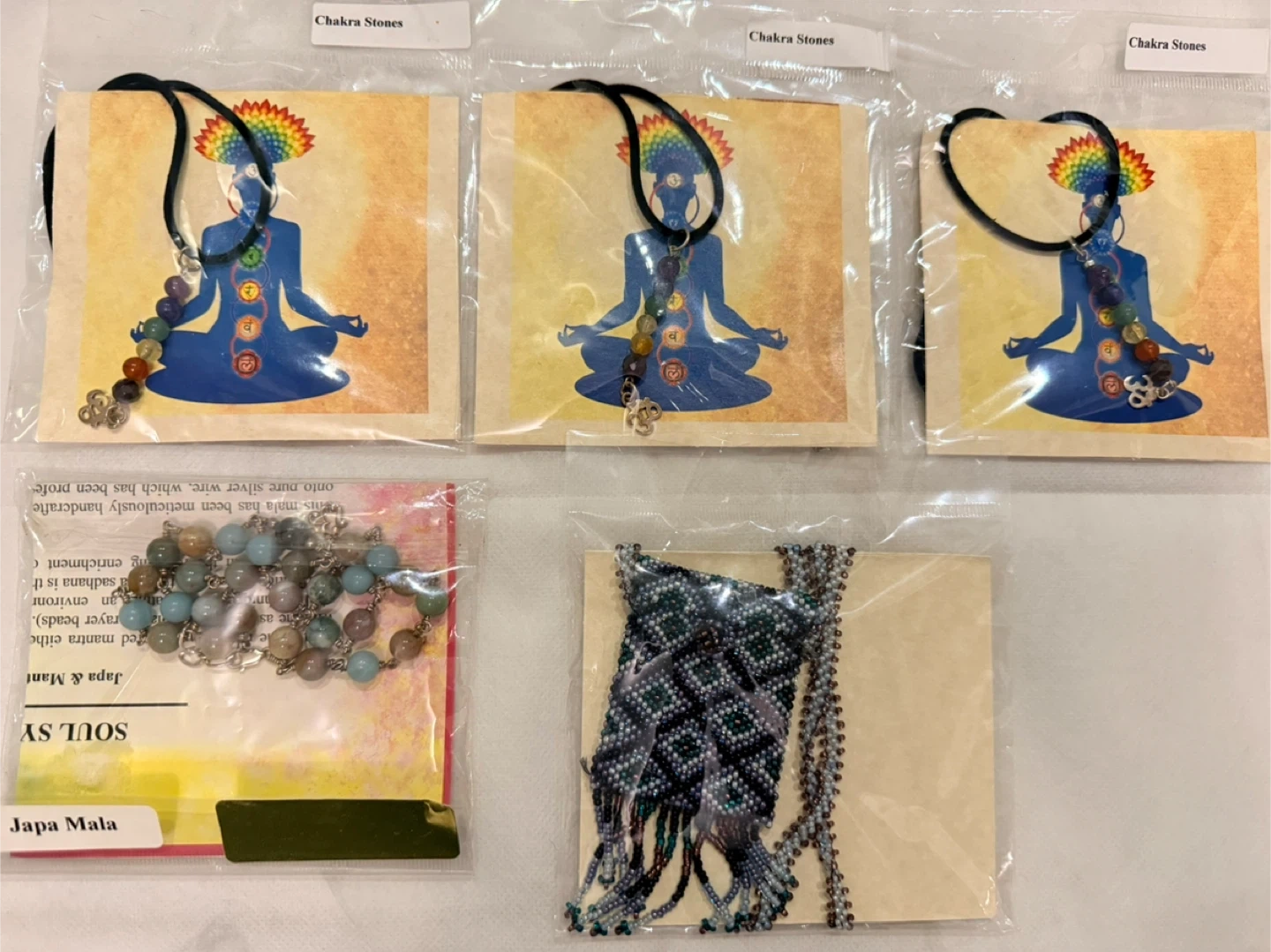 Variety of chakra stone sets, each containing 7 stones in a bag with a chart. Also includes malas and beaded necklaces. Stones include amethyst, clear quartz, carnelian, aventurine, and more. Great for energy work and meditation!