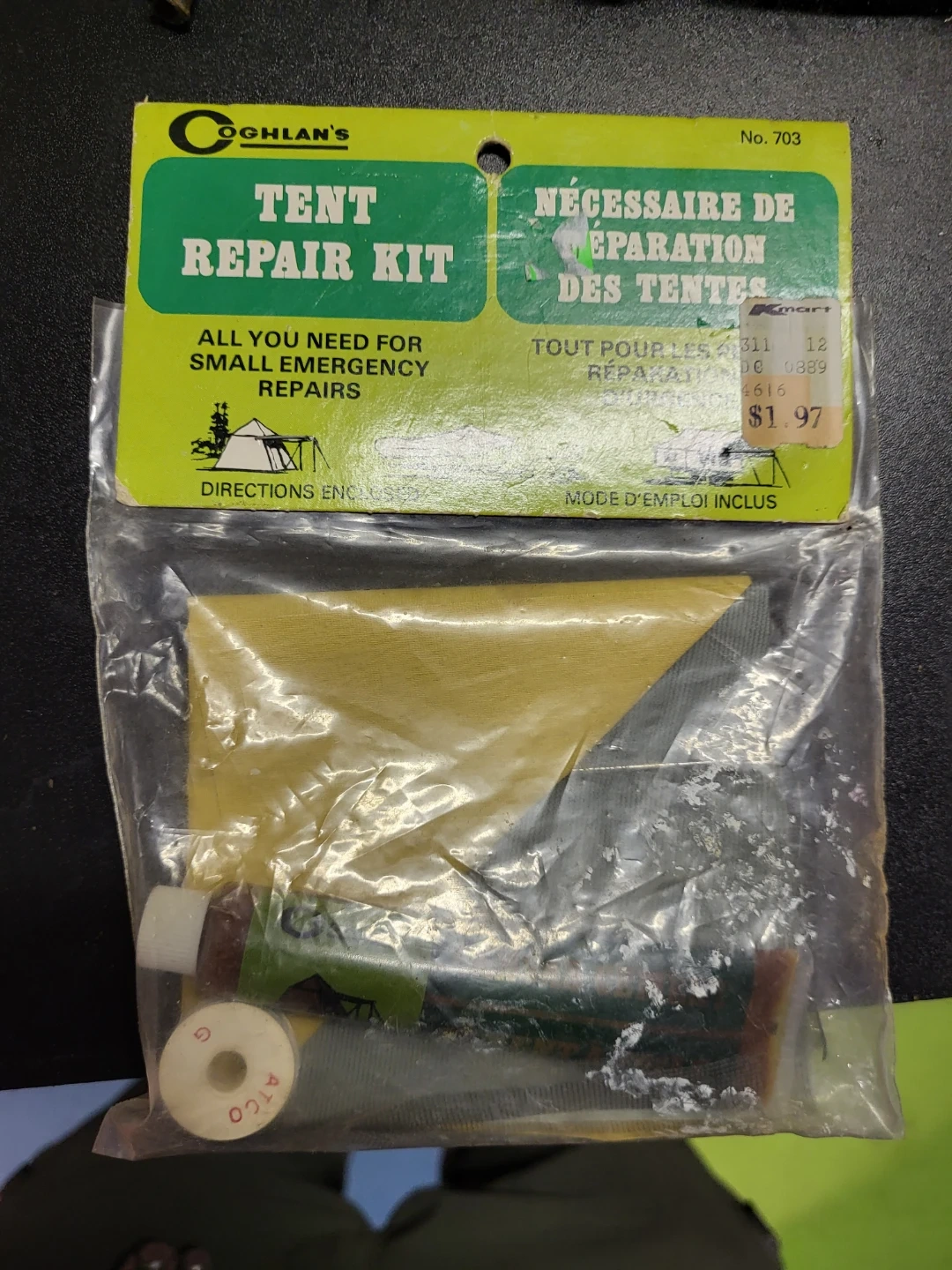 This Coghlan's tent repair kit is for small emergency repairs. It includes two pieces of approximately 8"x8" tent material, one piece of approximately 8"x8" nylon window screen, one spool of thread, one needle, and one tube of Coghlan's Canvas Cement. Directions are enclosed.
