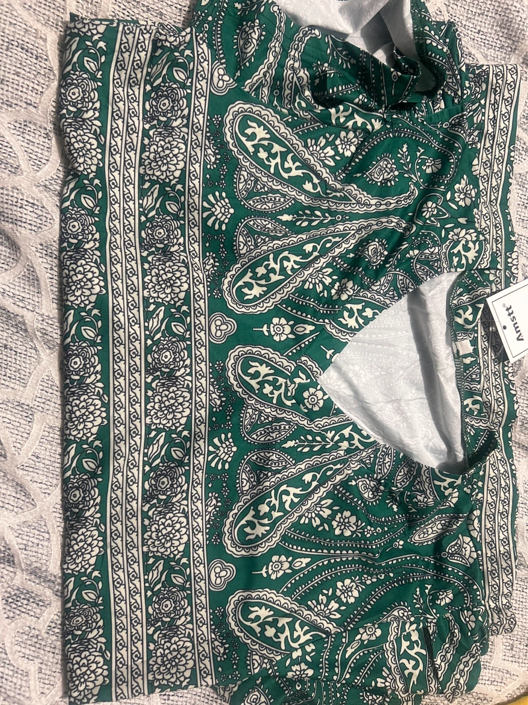 This blouse features a vibrant green hue with a classic paisley pattern.
