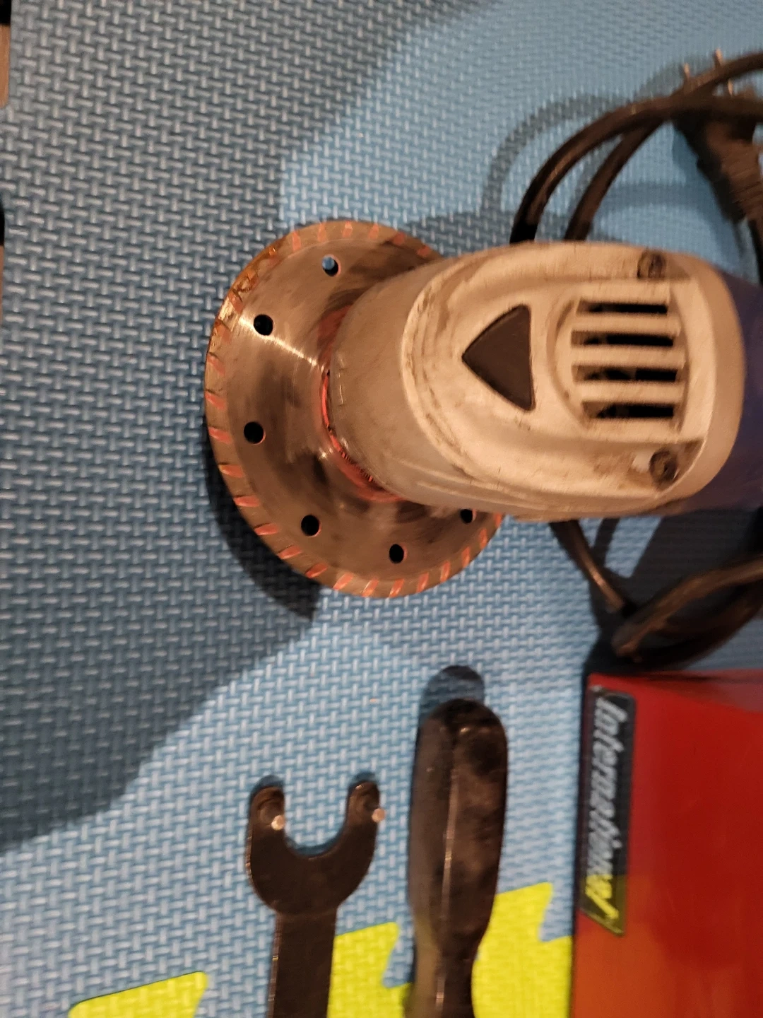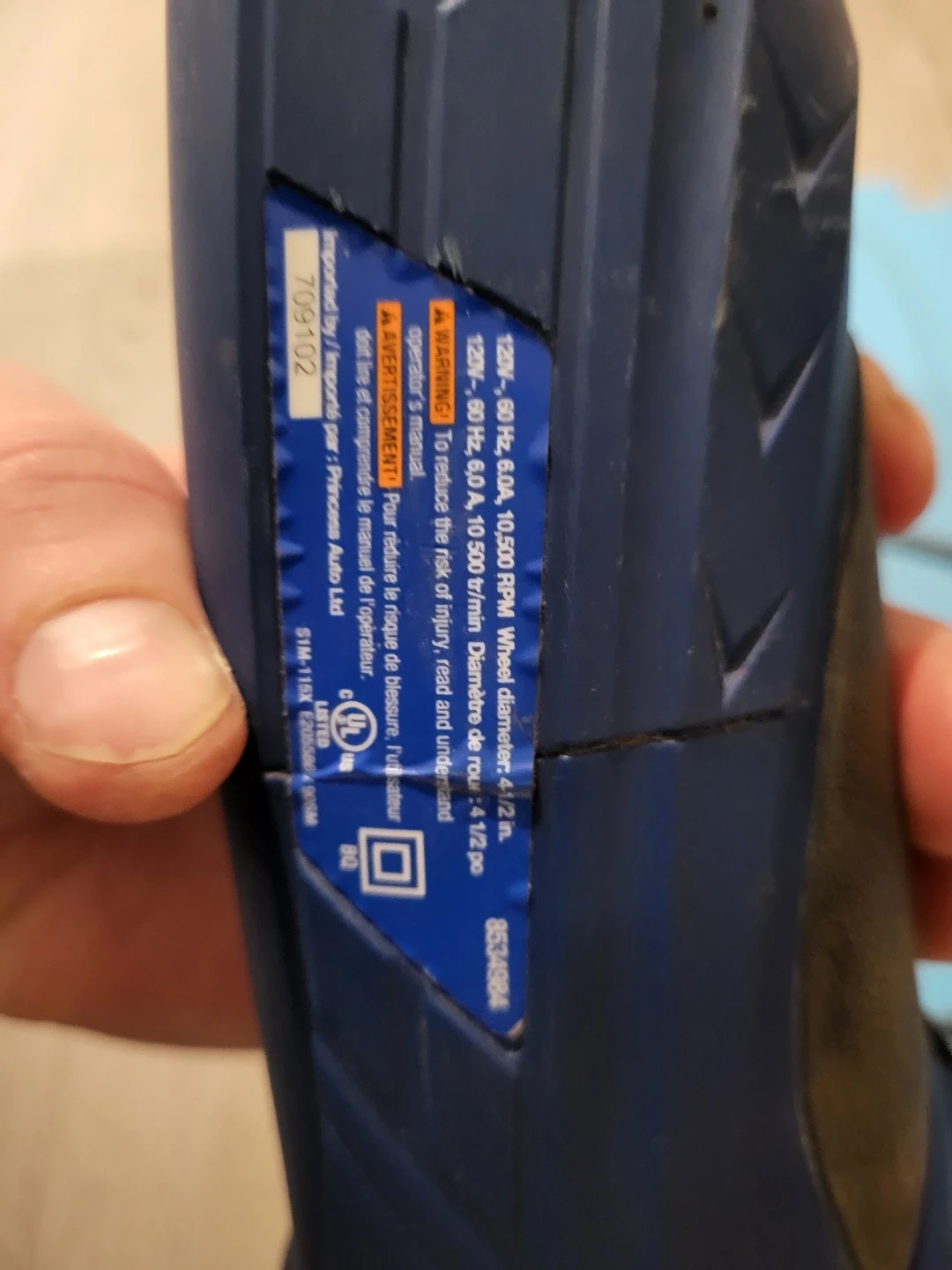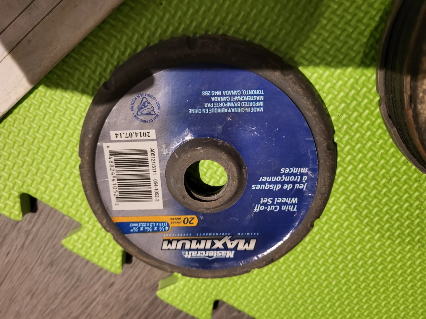 This set includes a Mastercraft angle grinder and a 20-piece thin cut-off wheel set. The grinder comes with a wrench, screwdriver, and guard. Some extra washers and a manual are also included. This is a handy kit for various cutting and grinding tasks.