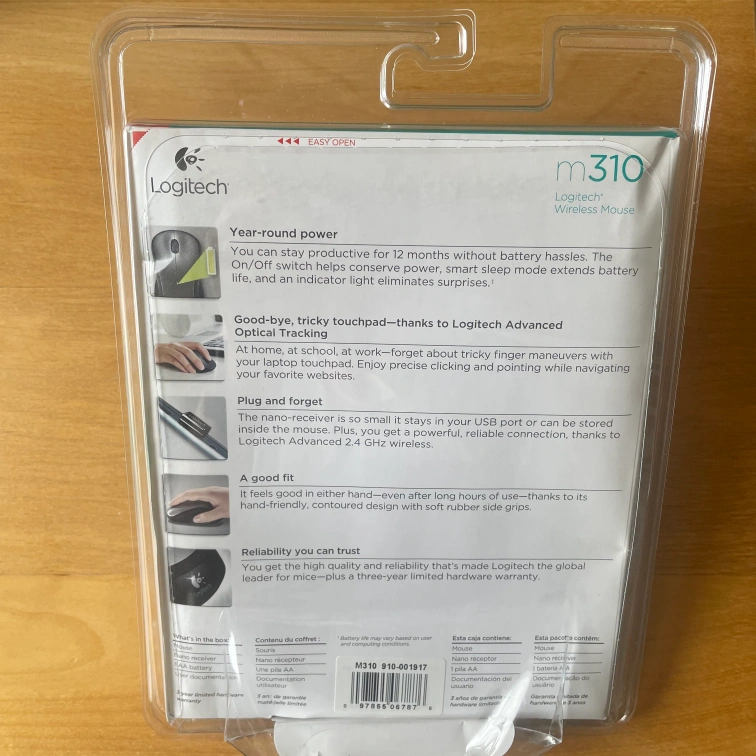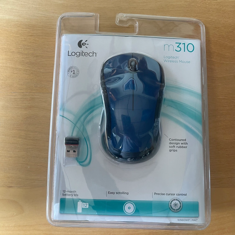 Logitech M310 Wireless Optical Mouse (blue color). It's in like new condition and comes with everything in the original packaging. Was bought for school but never ended up using, fully tested and everything works perfectly. It supports easy plug and play. it has three buttons, battery indicator, scroll wheel, and 1000dpi for reliable tracking.