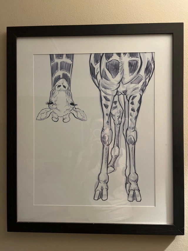 Add a touch of whimsy to your walls with this unique giraffe art piece, perfect for any room. The artwork features a playful depiction of a giraffe's perspective, drawn in a cool, minimalist style, complete with a sleek black frame. This piece is in good condition and ready to hang! 22” x 26”. If the ad's still up, yep, it's still up for grabs! Don't miss out on bringing this long-necked beauty into your home! Cash accepted.