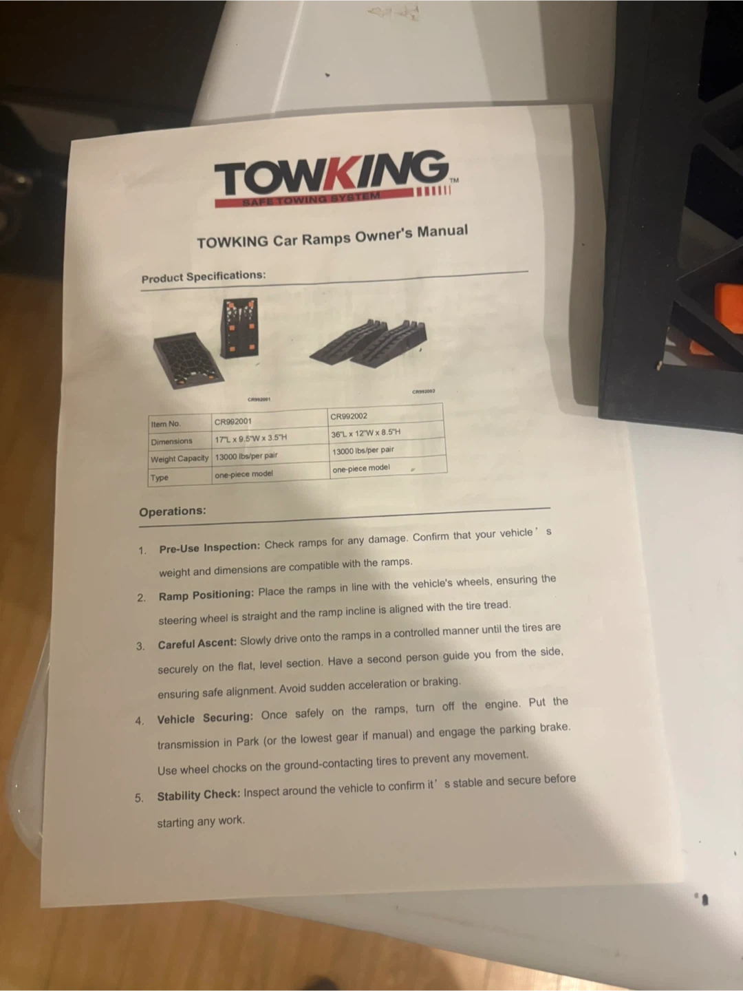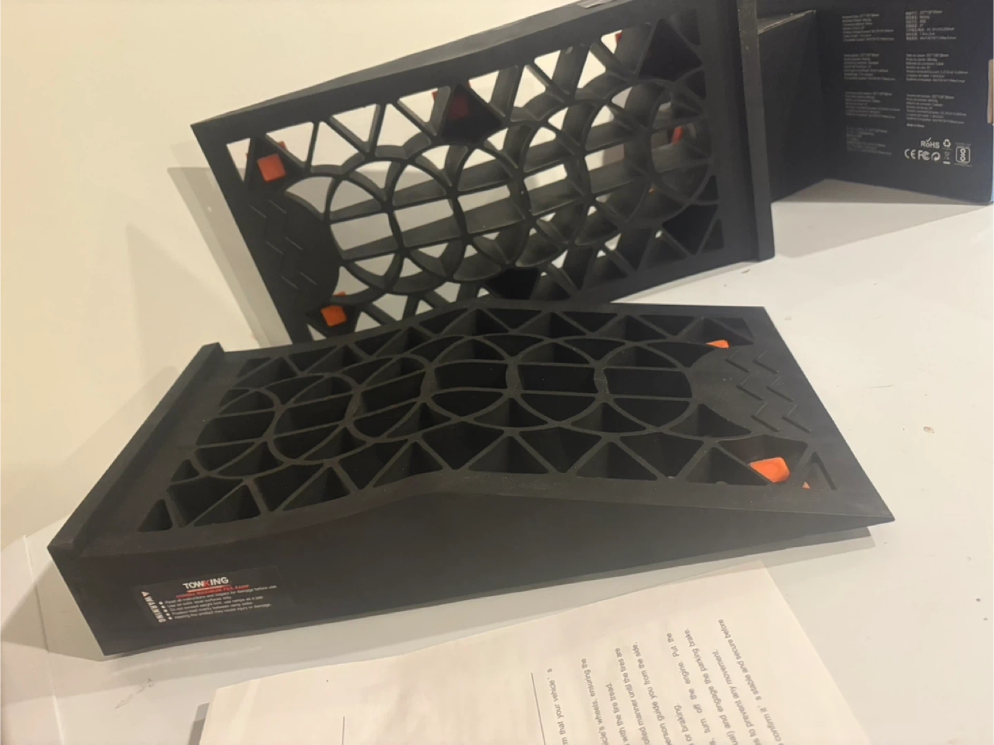 A pair of car ramps, Each ramp has a weight capacity of 13000lbs per pair. They're made of durable material and are designed for vehicle access. Ideal for low-profile vehicles needing a bit of extra clearance.