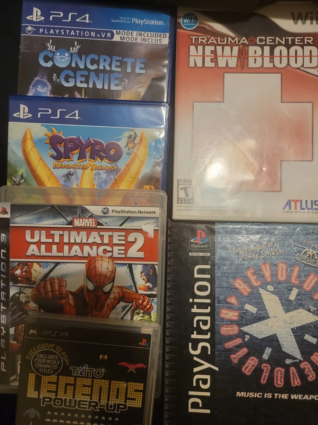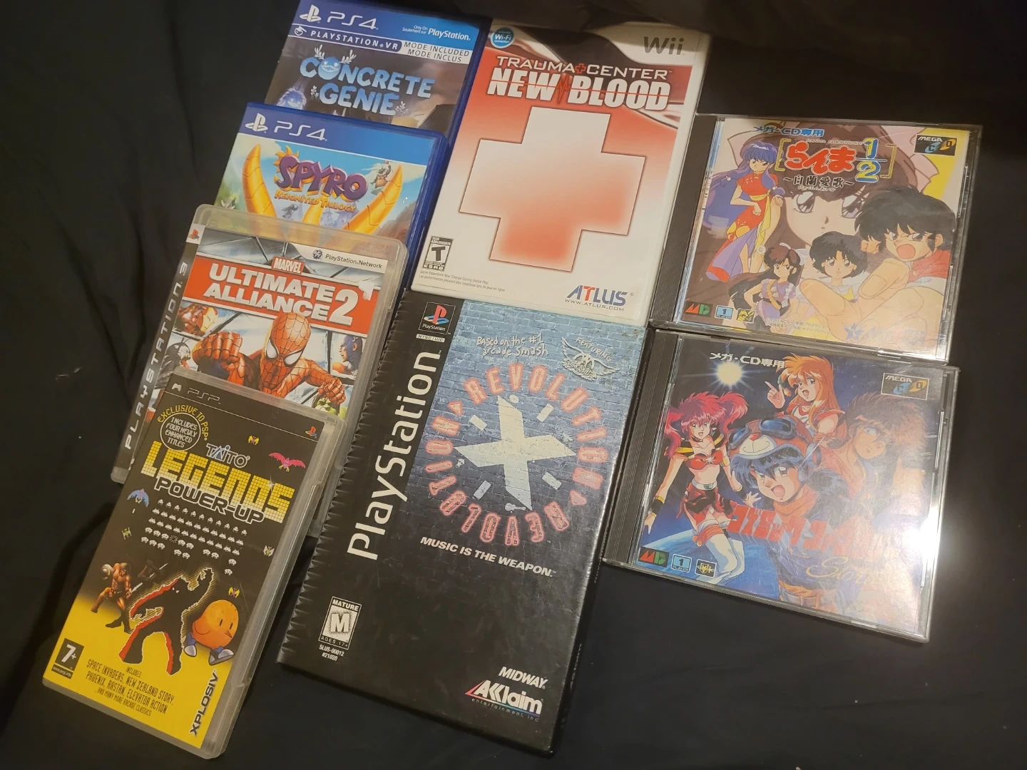 This lot includes various video games for different consoles. The collection features titles like Concrete Genie, Spyro Reignited Trilogy, Marvel Ultimate Alliance 2, and Trauma Center: New Blood. There are also Japanese Mega CD games included, such as 'Maison Ikkoku: Kagayaki no Kisetsu 2'.