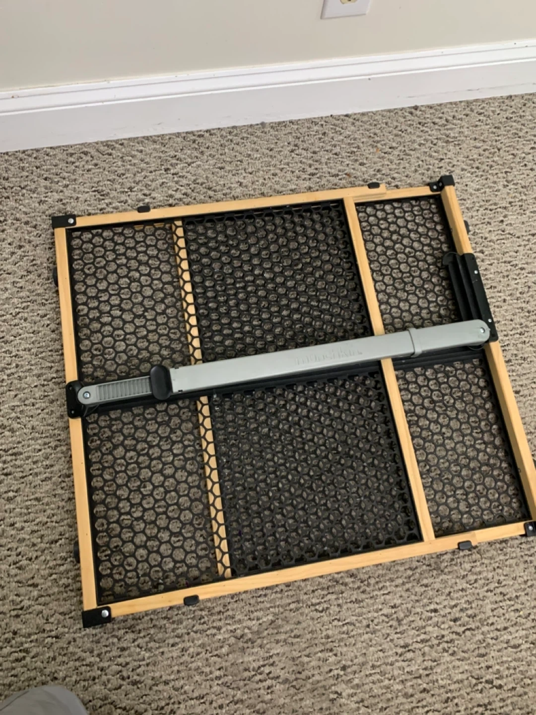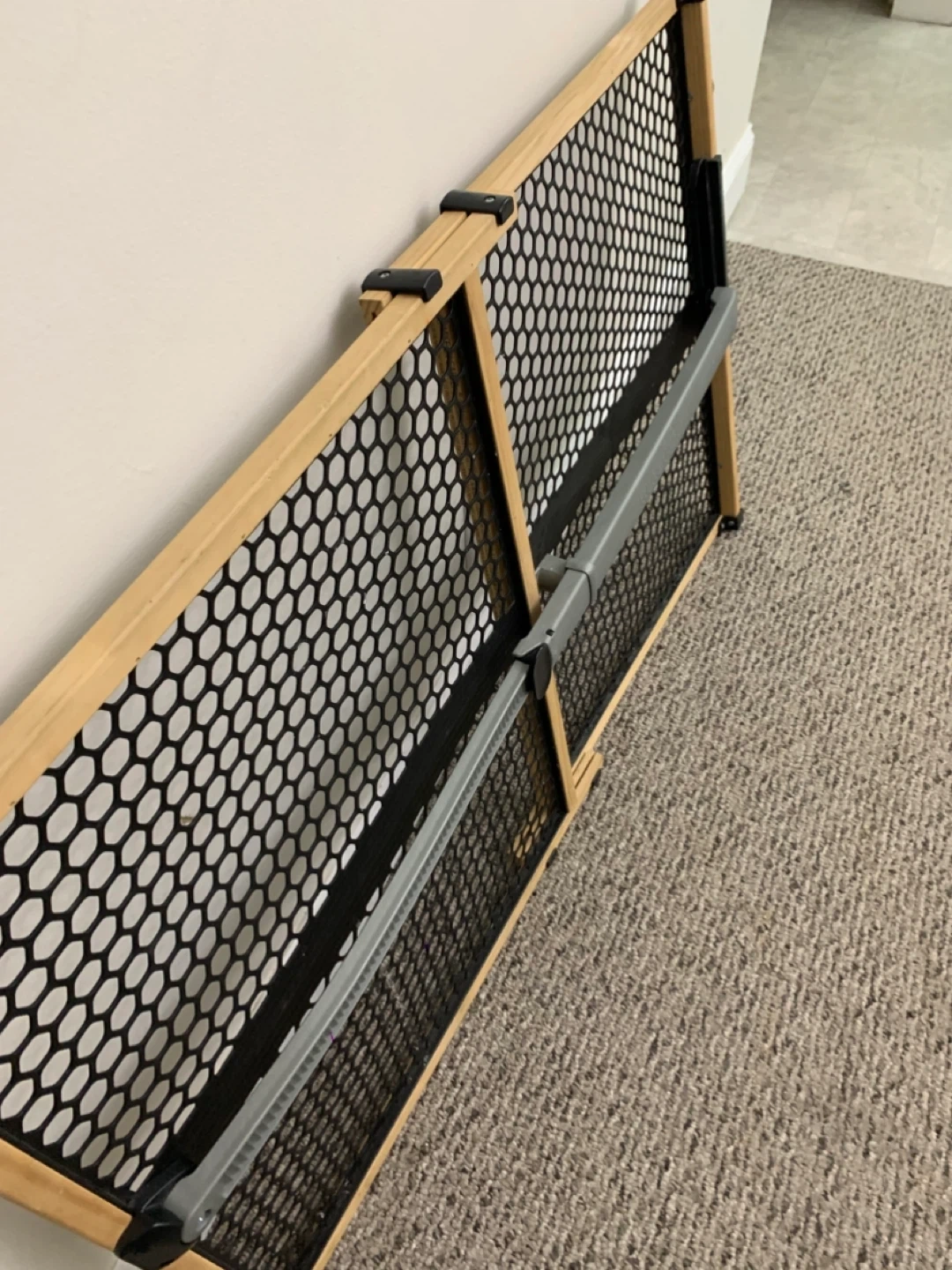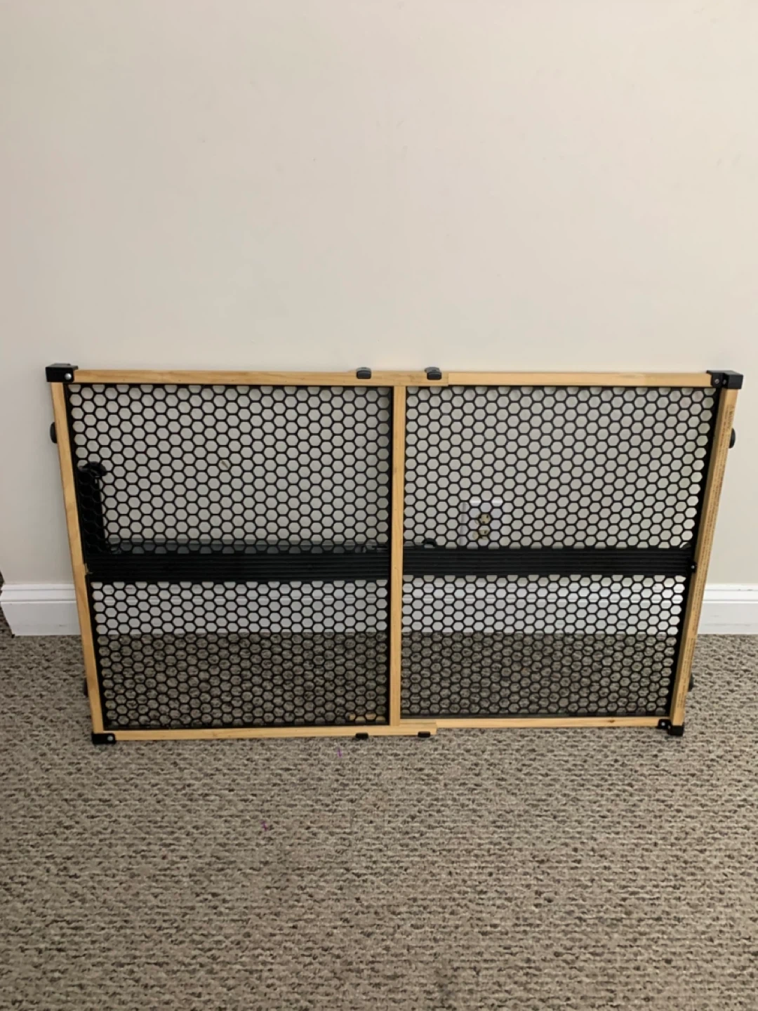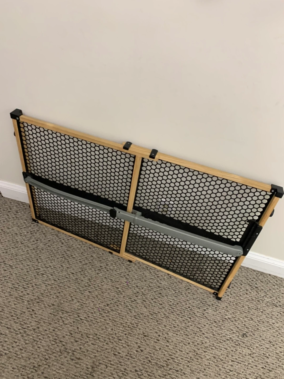 This is a wooden and metal baby gate or pet gate. It features a foldable design for easy storage. The mesh provides good ventilation.