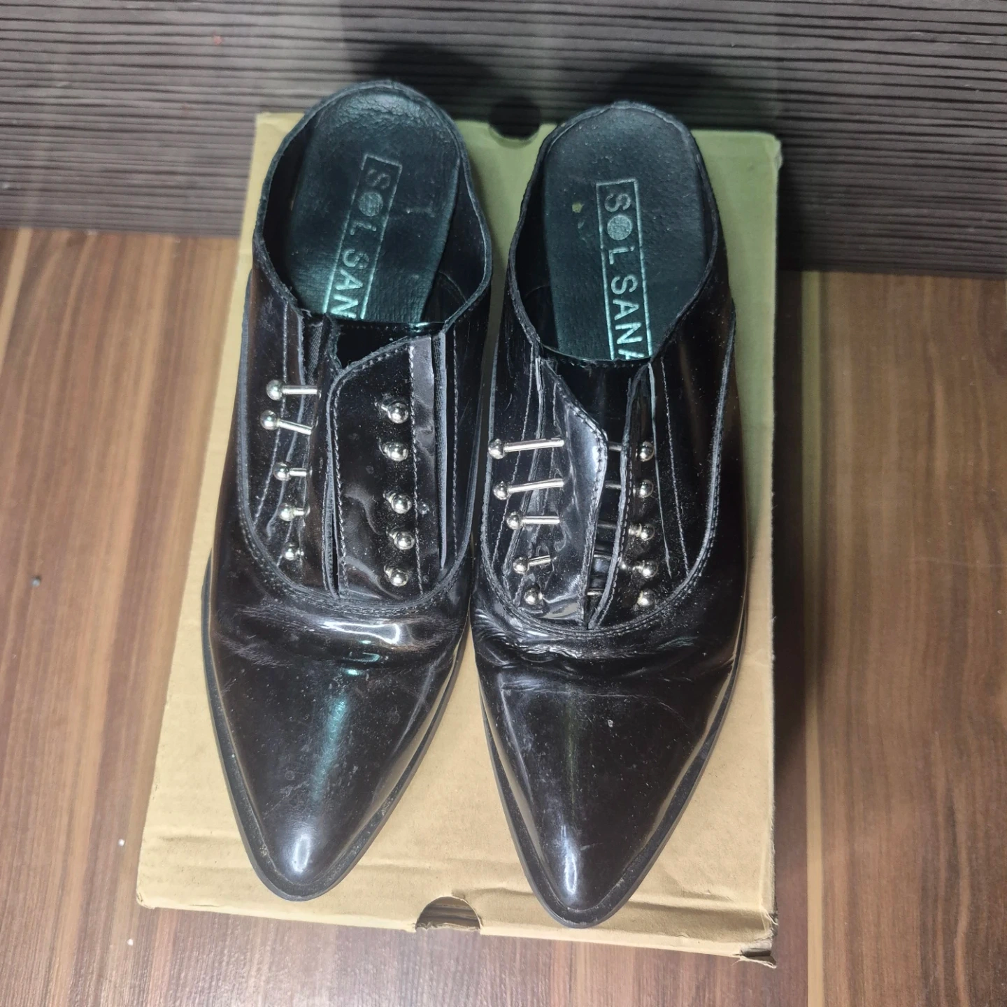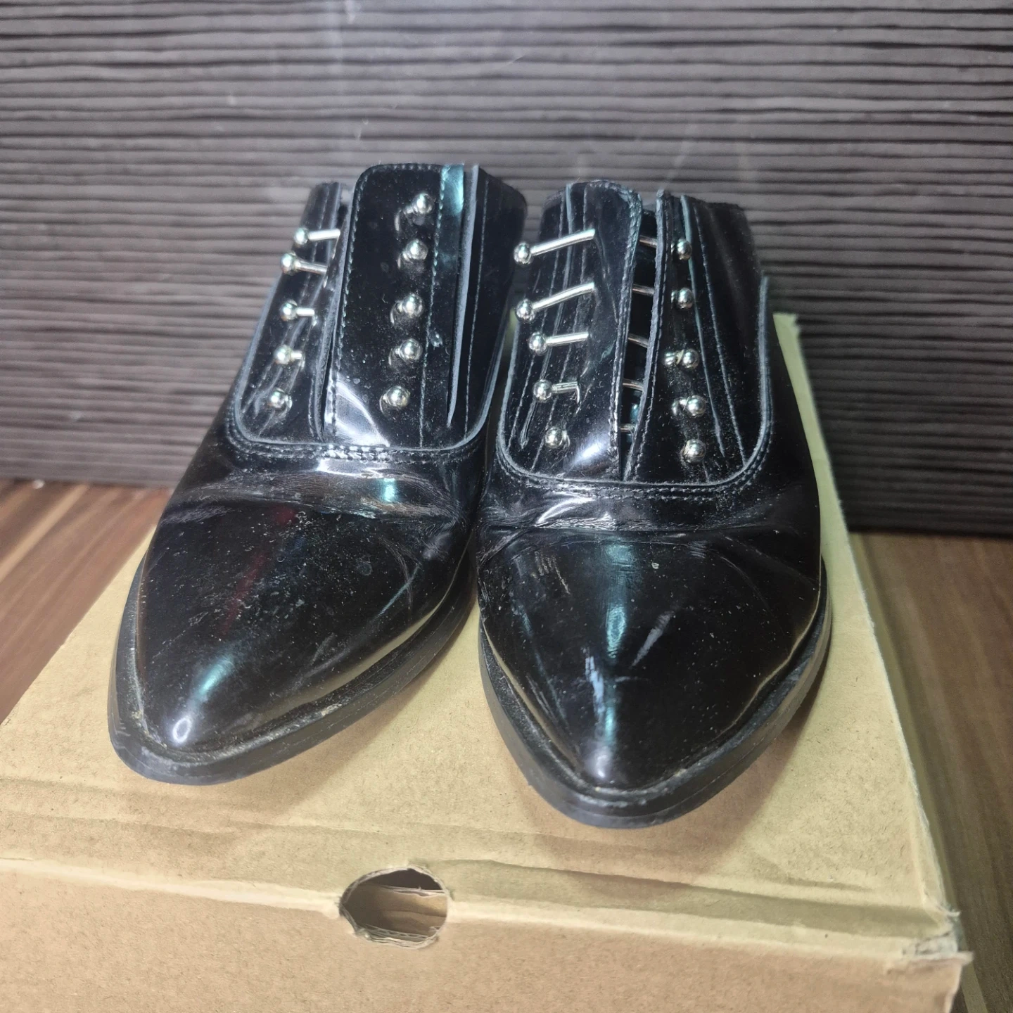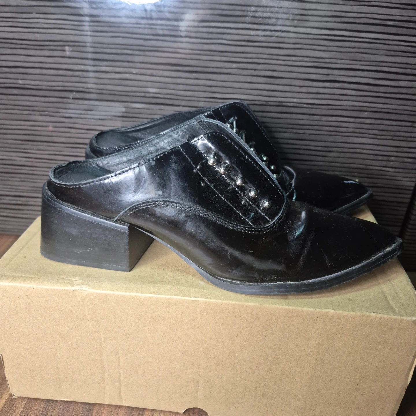 Stylish black patent leather mules with a pointed toe and decorative silver studs. These slip-on shoes have a block heel, making them comfy for everyday wear. They're made of patent material.