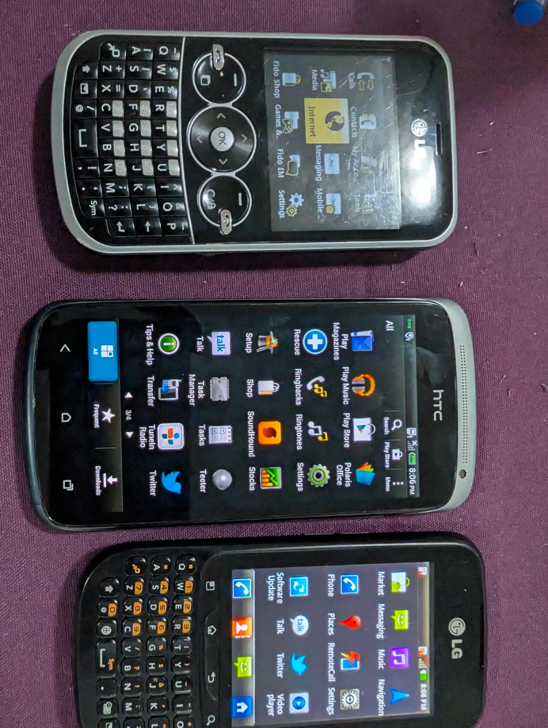 Bundle includes two LG phones with full QWERTY keyboards and one HTC smartphone. Includes charging cables. "Selling a working collection of mobile history. All three phones have been tested, factory reset, and come with their own charging cables.
