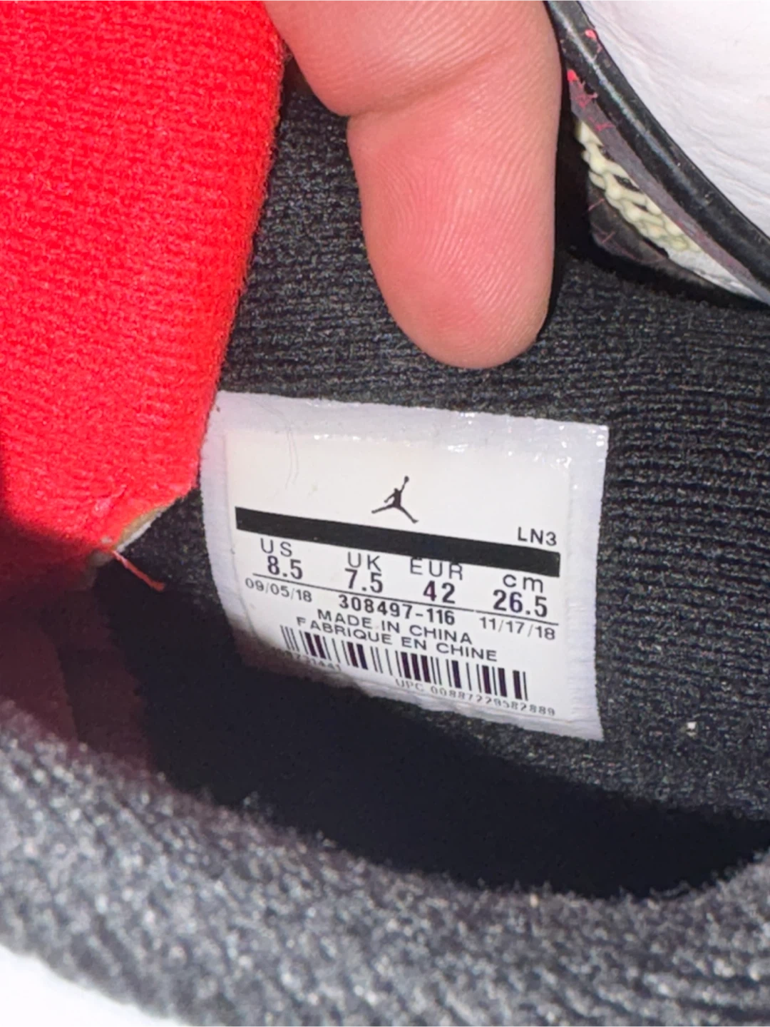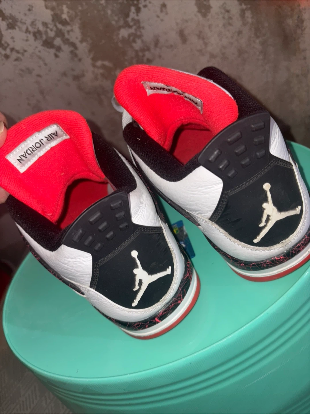 These are white Air Jordan 4 Retro sneakers with red and black accents. They're made of leather and feature a rubber sole. Size is 8.5 US, 7.5 UK, 42 EUR, 26.5 CM.