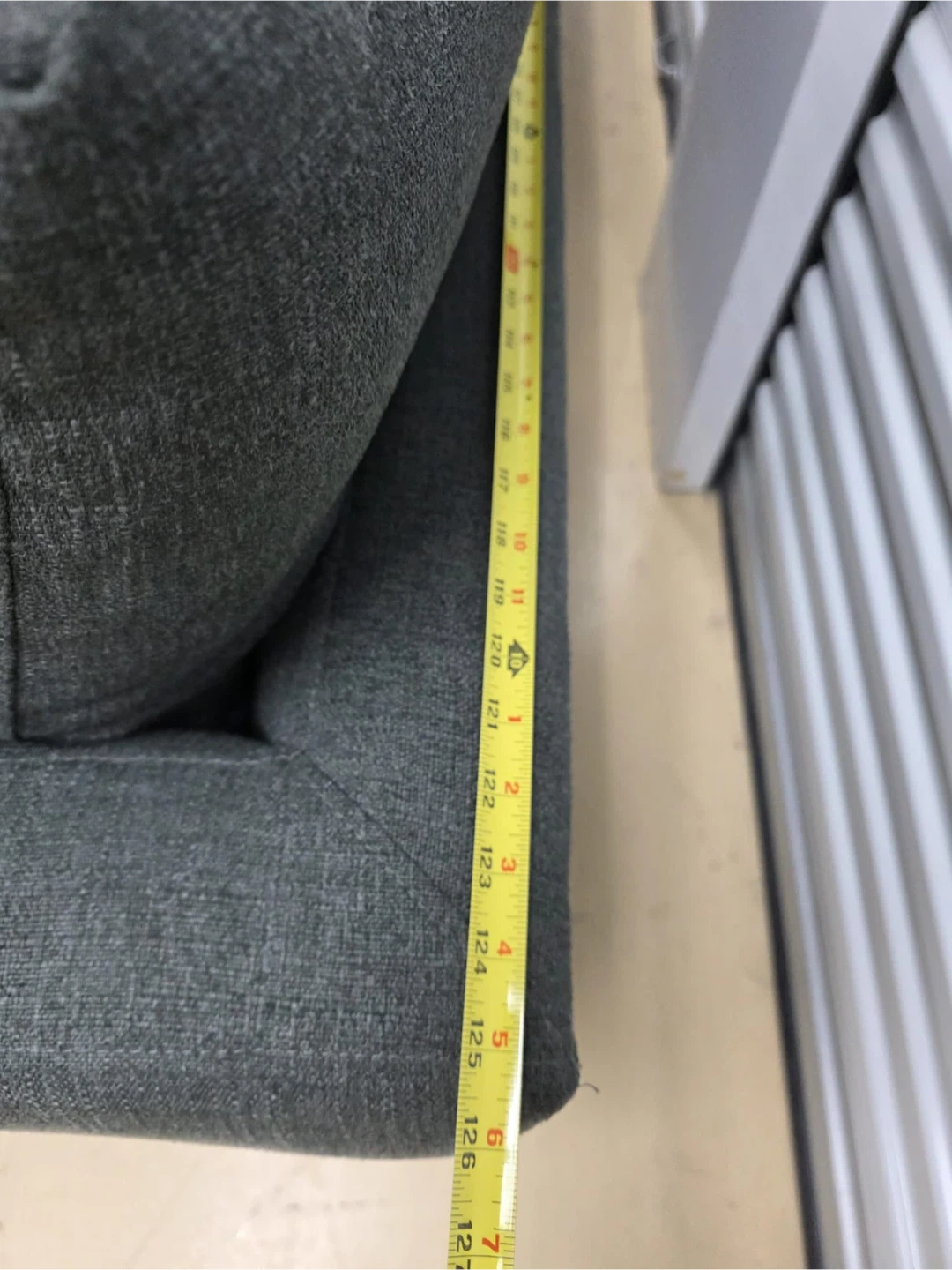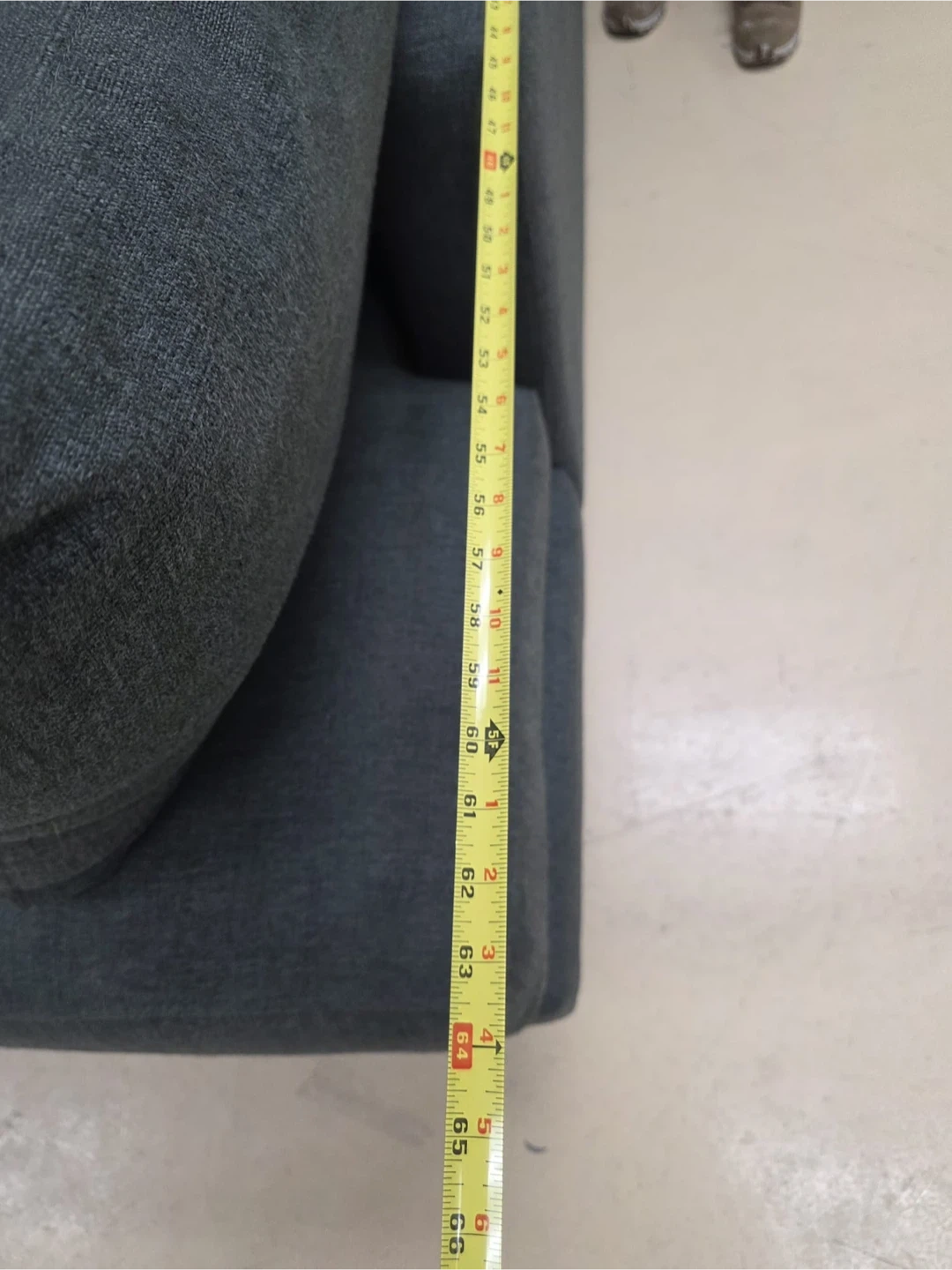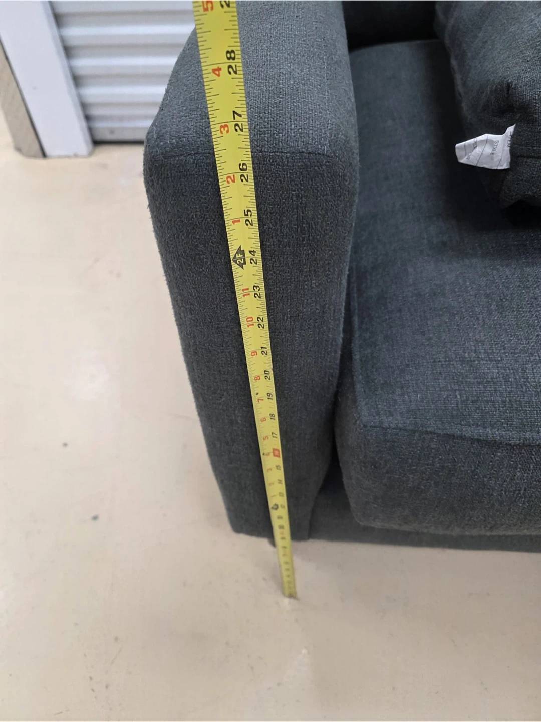 This is a dark grey sectional sofa with plush cushions. It's upholstered in a durable fabric. The sofa's arm height is approximately 25 inches.home delivery available
