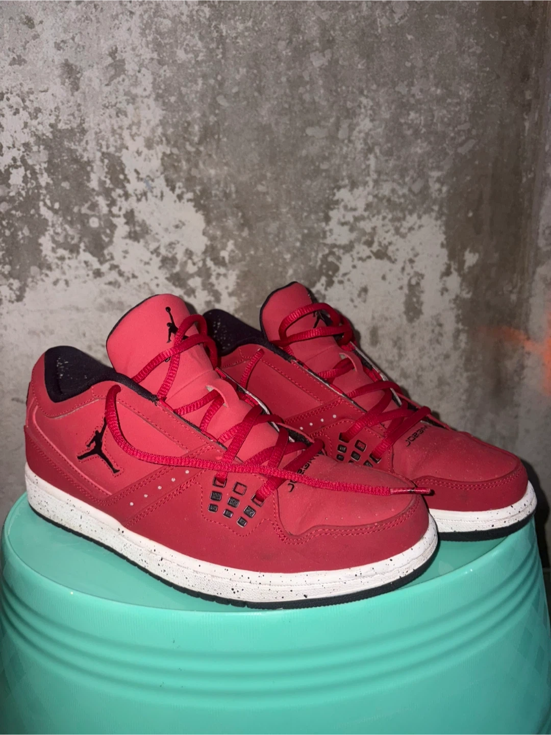 These are red Jordan sneakers. They feature a lace-up closure and a rubber sole. A classic choice for casual wear!