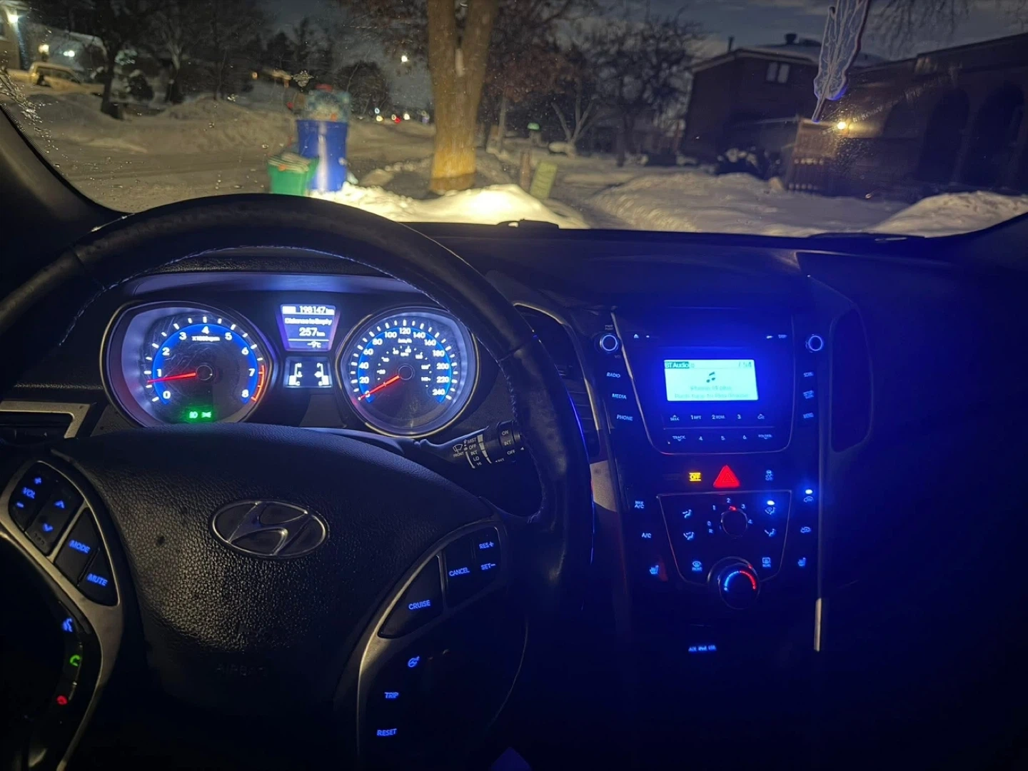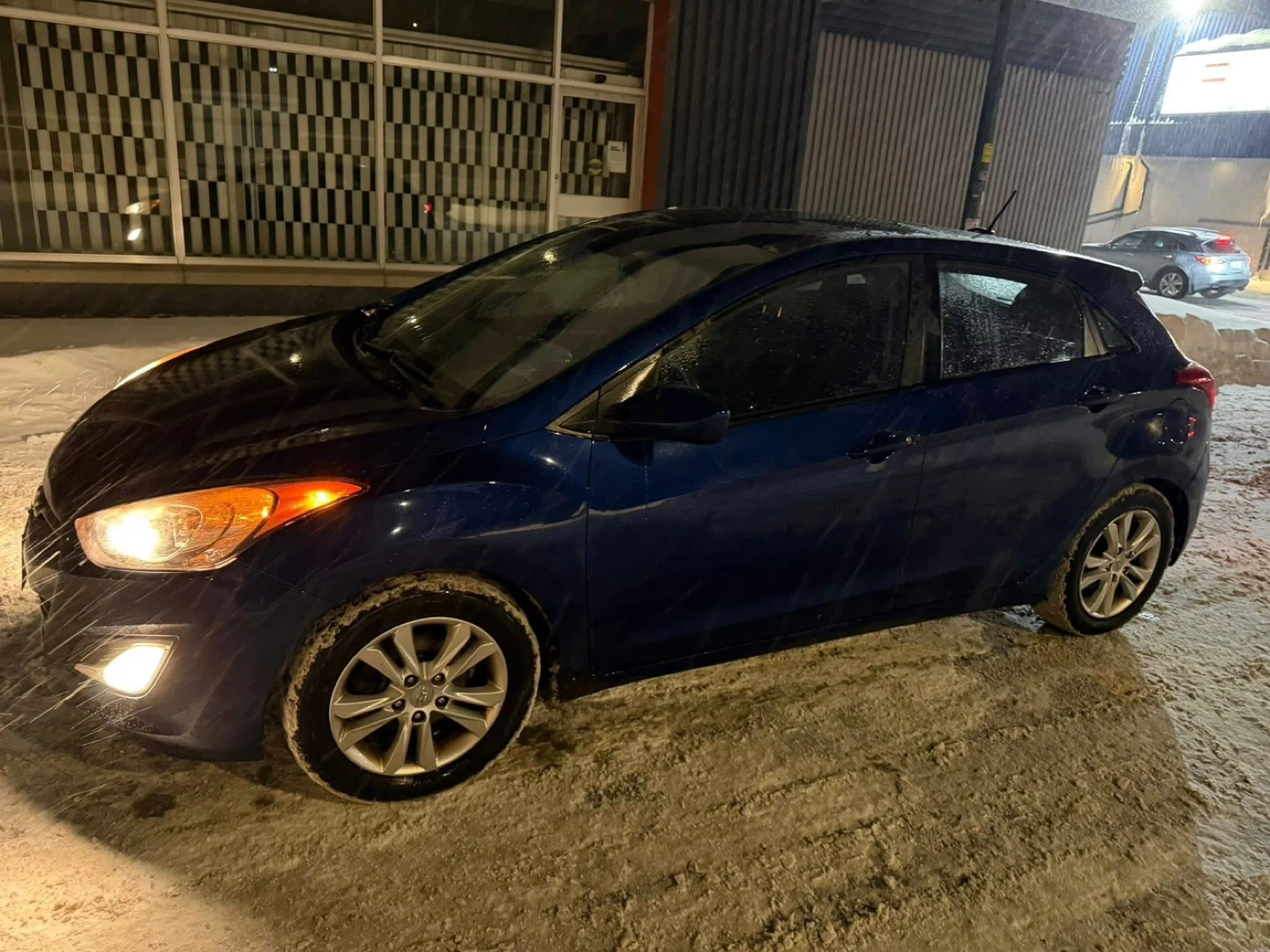 This is a blue Hyundai Elantra GT hatchback. It's equipped with comfortable cloth seats and a manual transmission. Ready for any road condition! 2013 as is