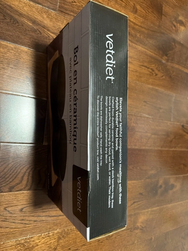 Brand new set of Vetdiet ceramic bowls with a bamboo tray, perfect for your pet's feeding needs. These bowls are stylish, durable, and designed to elevate your pet's mealtime experience. Brand: Vetdiet. Material: Ceramic bowls with bamboo tray. Capacity: 2 x 850 mL. Condition: New in box. Let me know if you're interested!