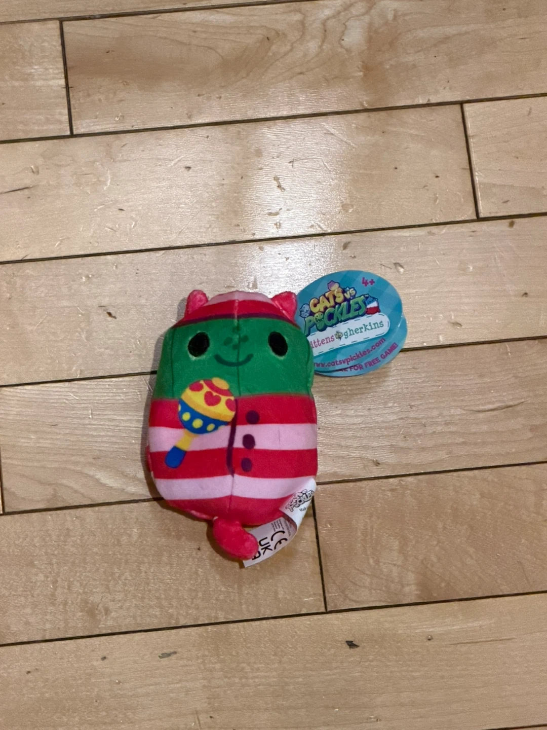 This is a cute plush toy from the Cats vs Pickles collection, featuring the "Kittens & Gherkins" character. It's soft and huggable! Recommended for ages 4 and up.